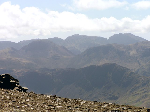The Scafells are out of the clouds now. Green Gable, Great Gable and Kirk Fell in front, and Haystacks in the first row.