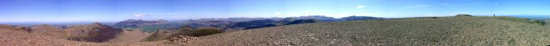 Panorama from eastern to southern direction, from Grisedale Pike. Skiddaw and Blencathra, the Pennines in the distance, the Helvellyn ridge, in the background the Scafells and Great Gable to the far right. Click into the picture for a larger version.