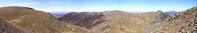 Western panorama from half way up Grasmoor. Whiteside ridge and Hopegill head to the far right. Click into the picture for a larger version.