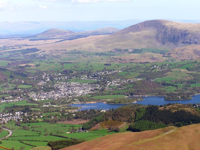 Keswick and Derwent Water, behind Keswick is Great Mell Fell and Little Mell Fell with the Pennines behind, far right is Clough Head at the beginning of the Helvellyn ridge.