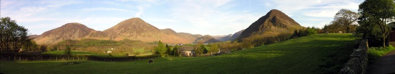Panoramic shot from shortly above Lanthwaite Farm. Red Pike and Crummock Water, Mellbreak, Blake Fell and Bield/ Low Fell. Lanthwaite farm in the foreground. Click into the picture for a larger version.