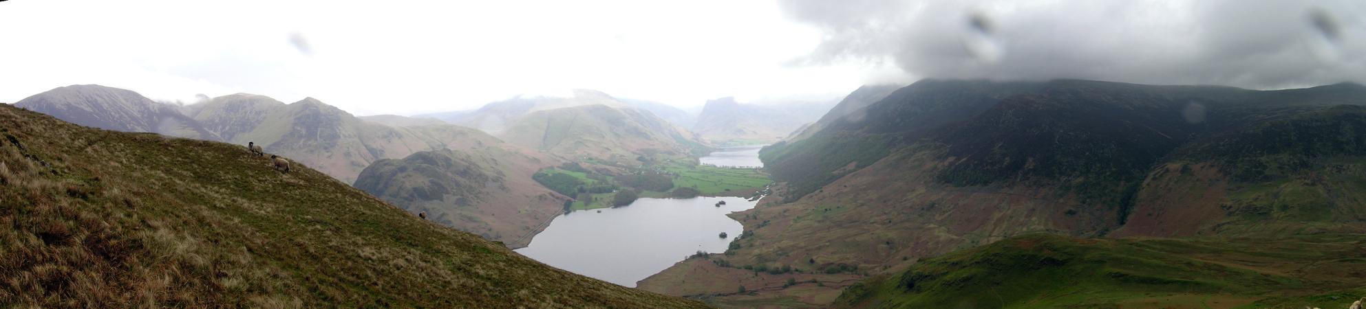 Panoramic view, with Grasmoor and Whiteless Pike to the left, the head of Crummock Water with Rannerdale knotts to its left side, and lake Buttermere with fleetwith Pike behind. Red Pike in clouds.