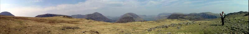 Panorama, from left to right: a first glimpse of Great Gable, Kirk Fell, Pillar, Ennerdale, High Stile with Hay Stacks in front, the Buttermere valley with Mellbreak to its left, Grasmoor, Crag Hill, with Fleetwith Pike in front, Robinson and Hindscarth. Far right is Grey knotts. Click into the picture for a larger version.