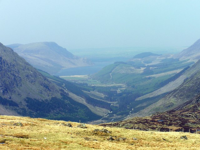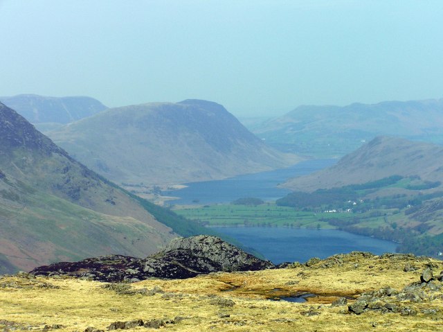 The Buttermere Valley with Mellbreak to the left, Loweswater fells behind Crummock Water in the distance.