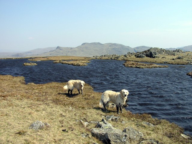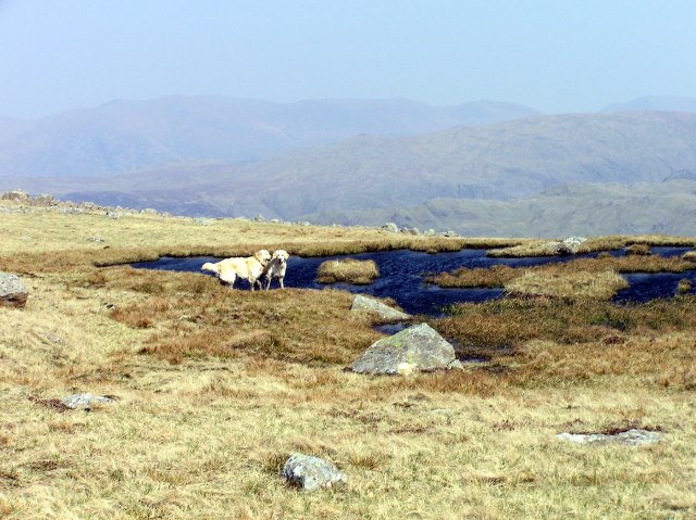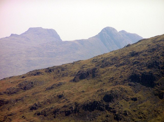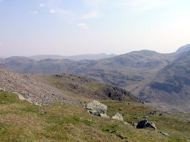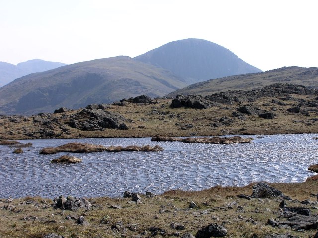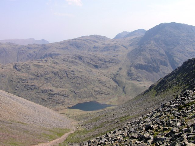 Styhead Tarn, a glimpse of Sprinkling Tarn and Great End with Bow Fell in behind. Far left in the distance the Langdale Pikes.