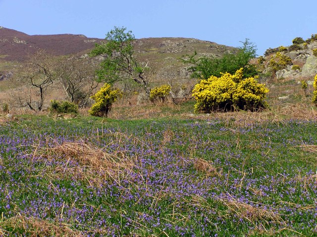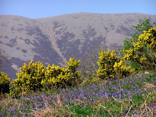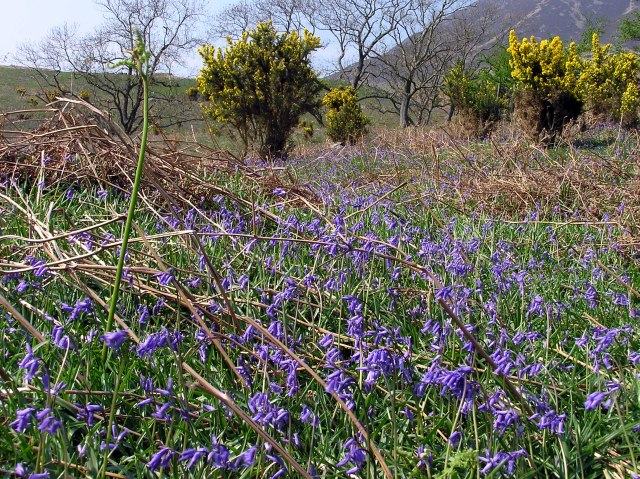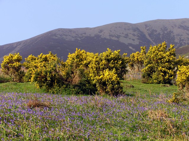 The gorse gives beautiful colour contrrast to the blue of the bluebells. Whiteless Pike in the background.