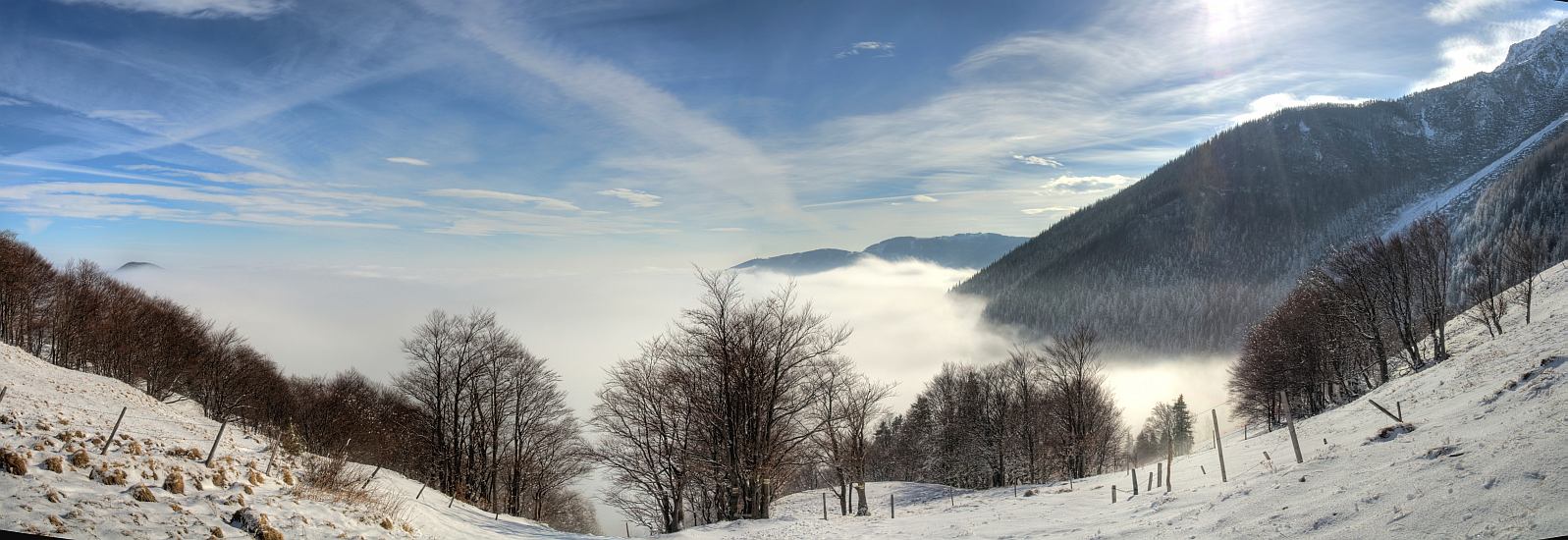 Panoramablick von unterhalb des Fadensattels nach Osten. Über Puchberg und Losenheim, ja über dem ganzen Osten Österreichs liegt eine dicke Hochnebeldecke.