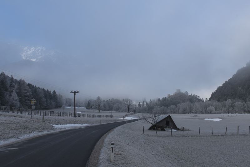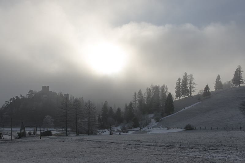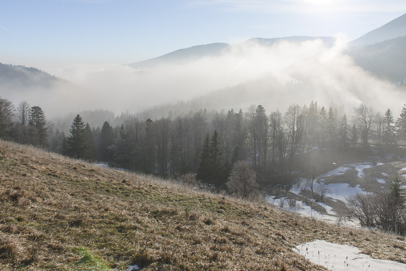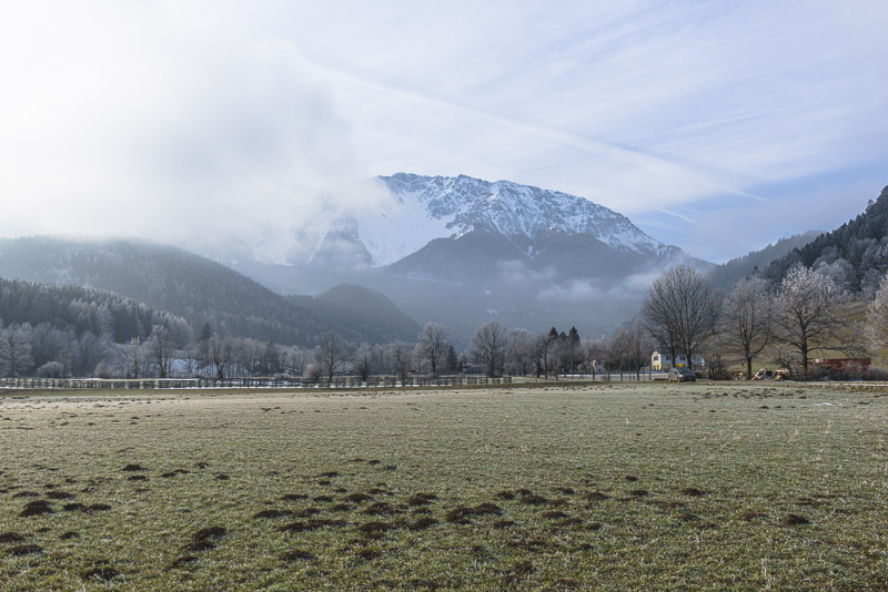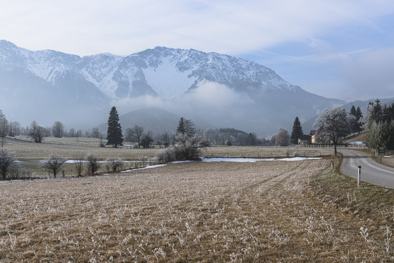 Knapp vor Losenheim lichtet sich der Nebel und der Schneeberg schaut ein wenig durch.