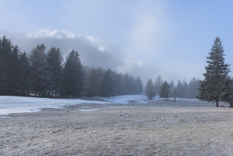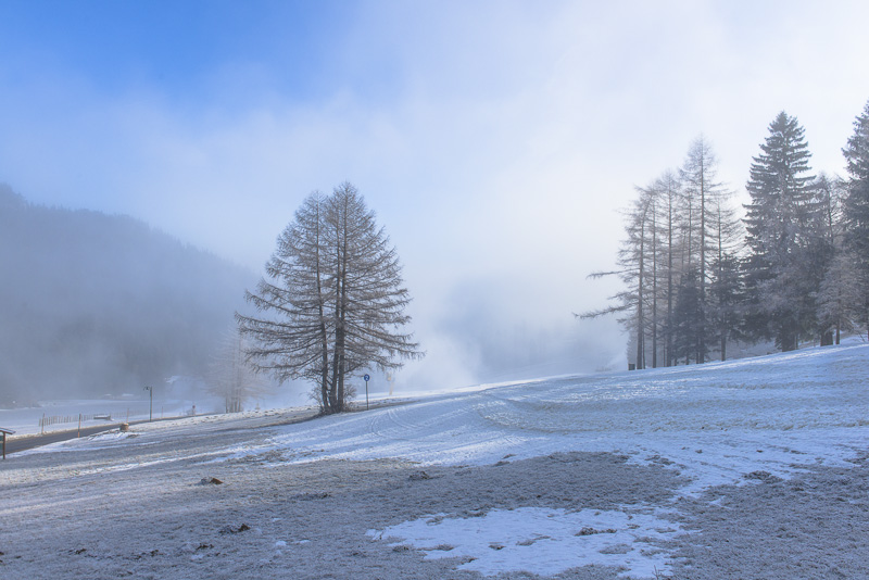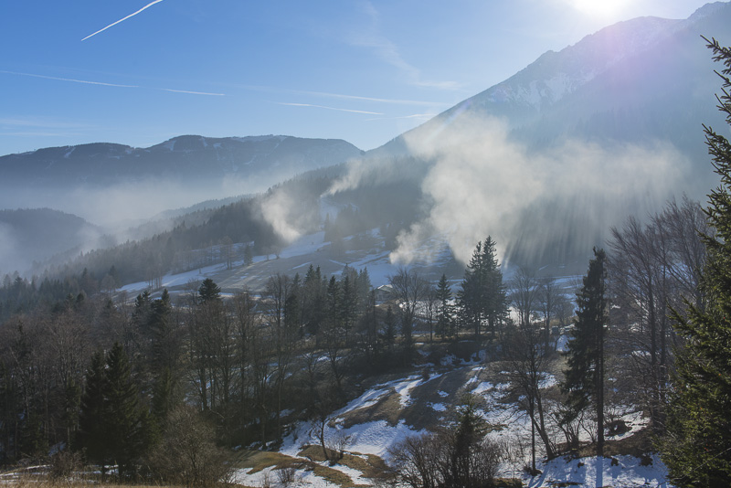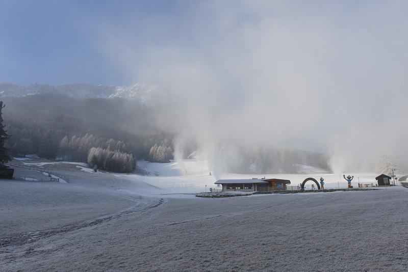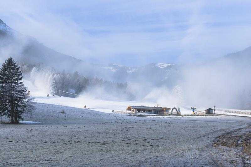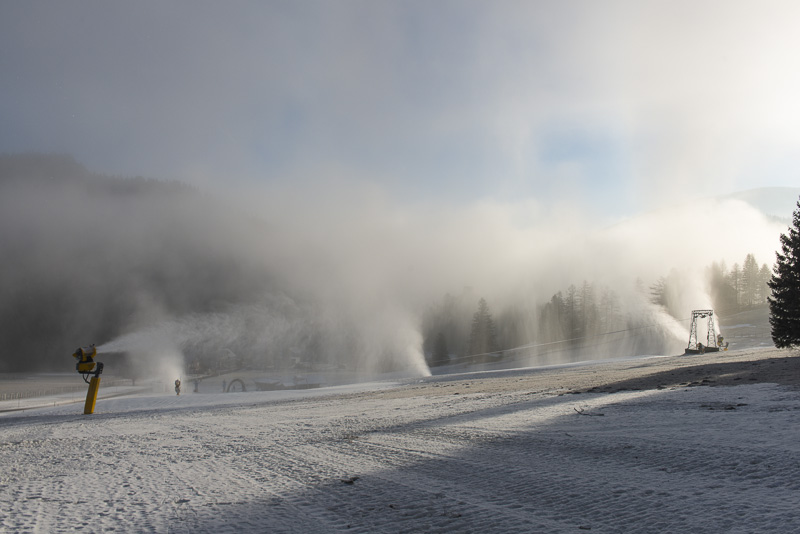 Hinten beim Schlepplift angekommen zeigt sich, dass der Nebel hier Konkurrenz bekommen hat: die Schneekanonen sind an!