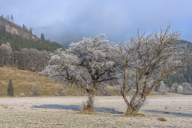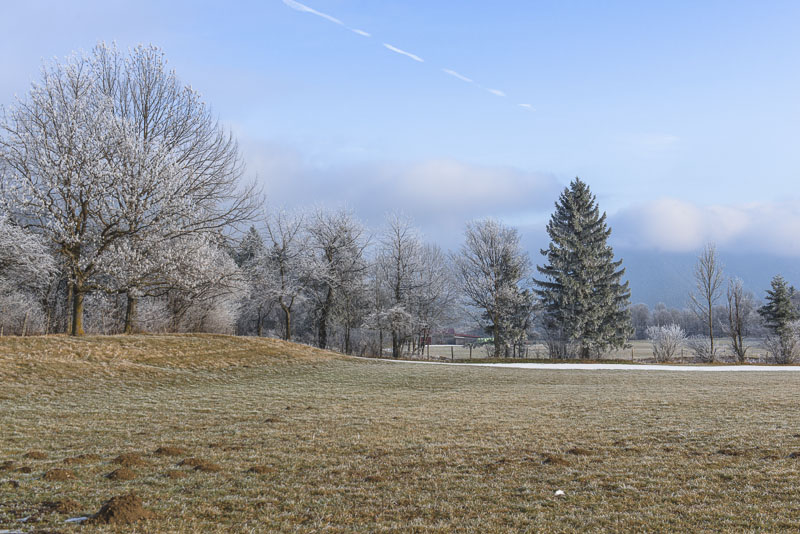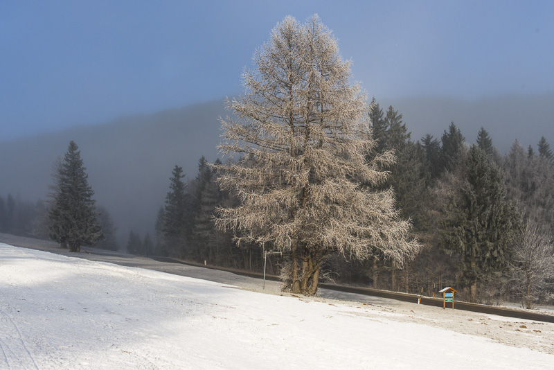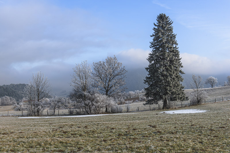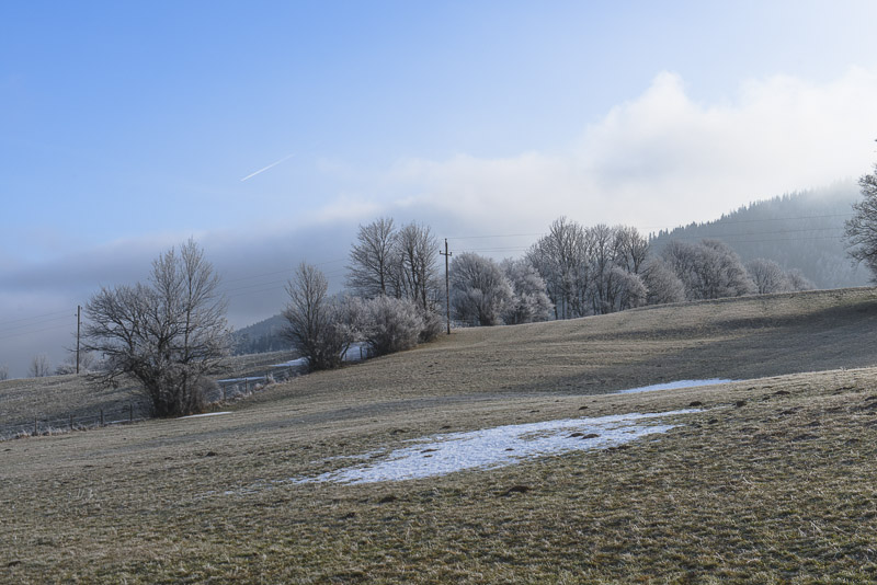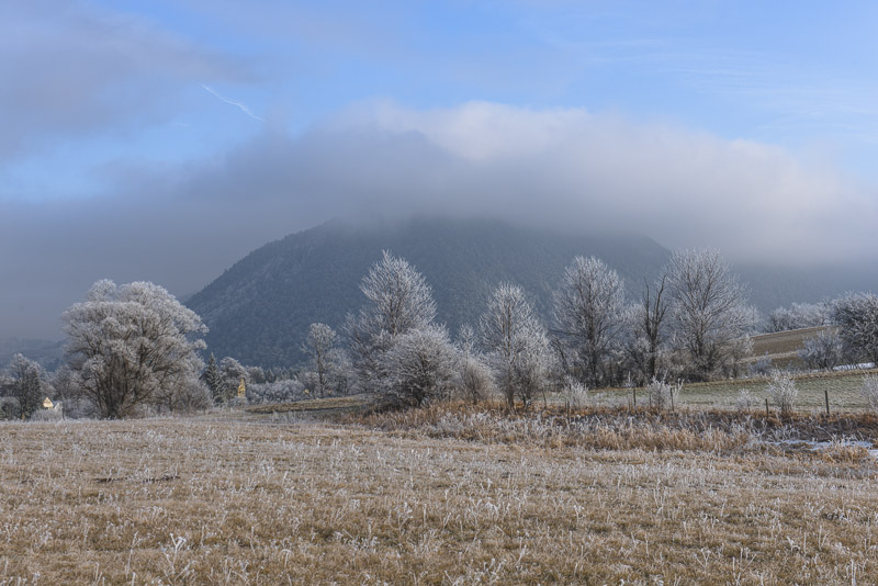 Raureif auf den Bäumen knapp unter der Nebelgrenze