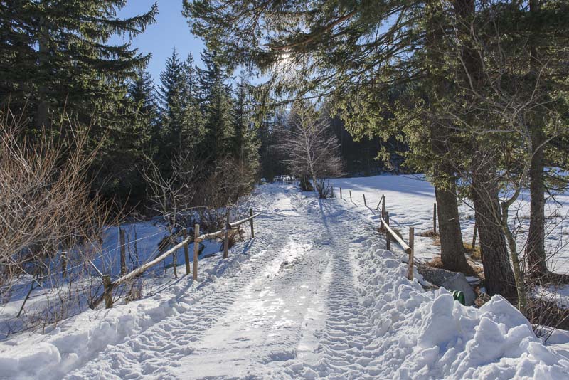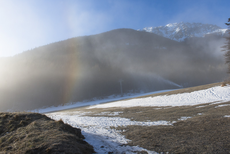 Weiter oben beim Sessellift wandere ich jetzt los. Die Kunstschneekristalle produzieren einen farbigen Halo um die Sonne, der mich an einen Zirkumzenitalbogen erinnert - nur eben künstlich.