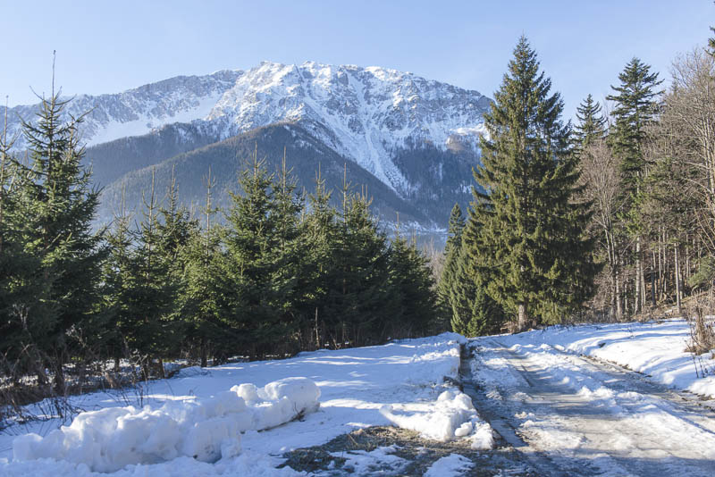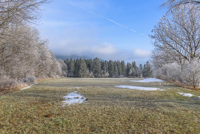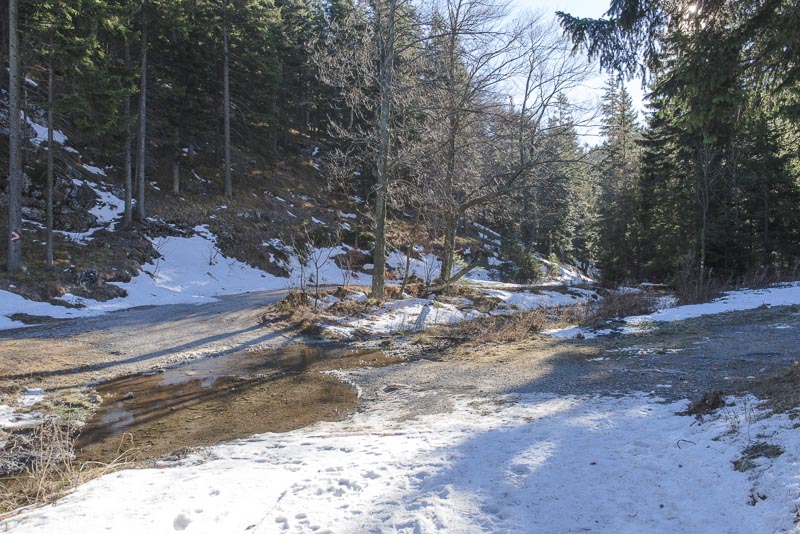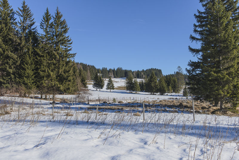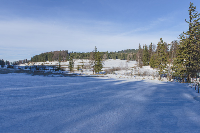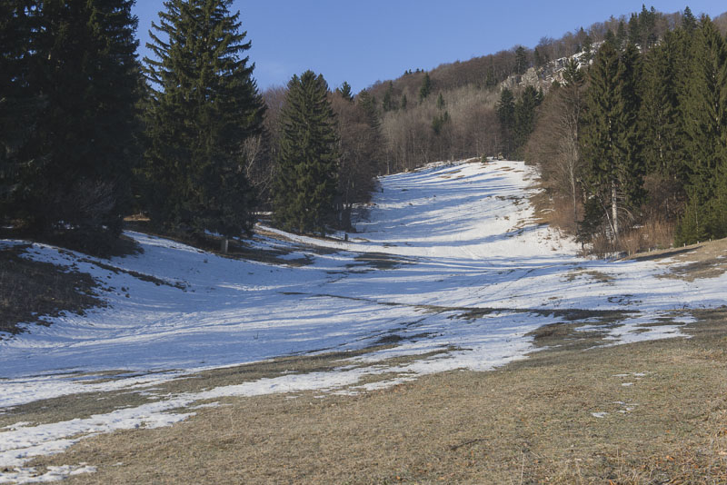 Etwas den Hang hinunter, und schon liegt kein Schnee mehr - nur noch im Schatten der Bäume.