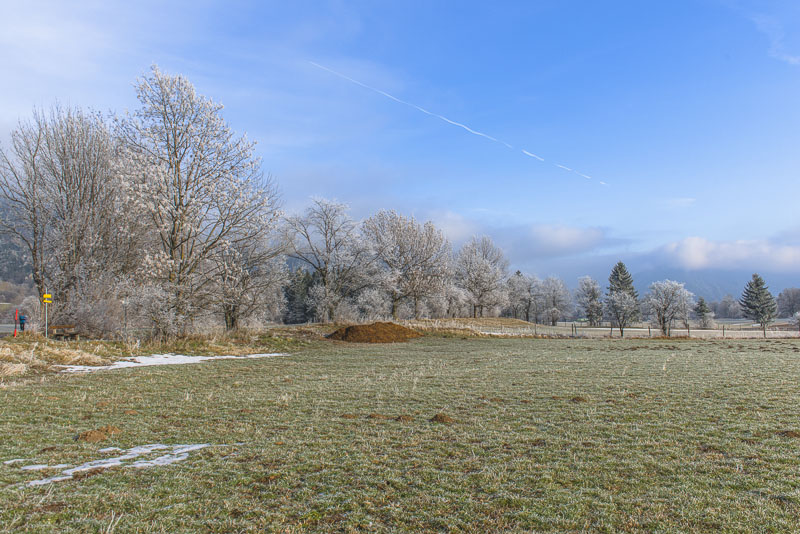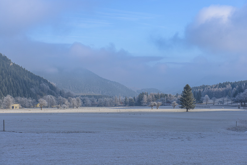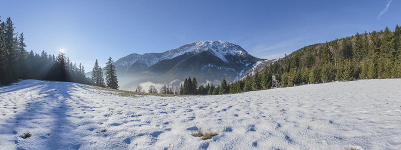 Ruhige Hochdruckwetterlage bedeutet: Sonne und hohe Temperaturen auf den Bergen, Nebel und Frost in den Tälern. Auf http://www.Schneeberg.tv sehe ich, dass der Nebel bis etwa 900 m hinaufreicht, dass aber der Talschluss bei Losenheim frei ist. Als Temperatur wird angezeigt: Losenheim (831 m) -6 °C, Edelweißhütte (1.248 m) +8 °C !!! Dieser Unterschied ist extrem, an eine solch hohe Differenz kann ich mich gar nicht erinnern.