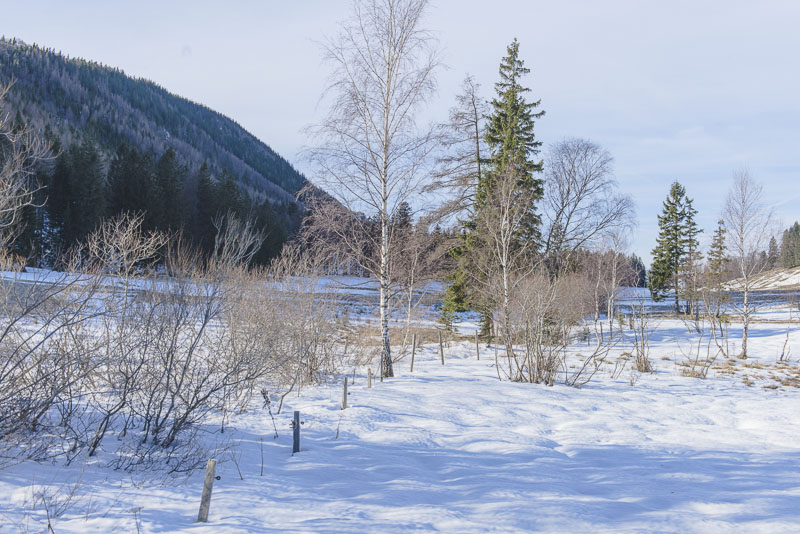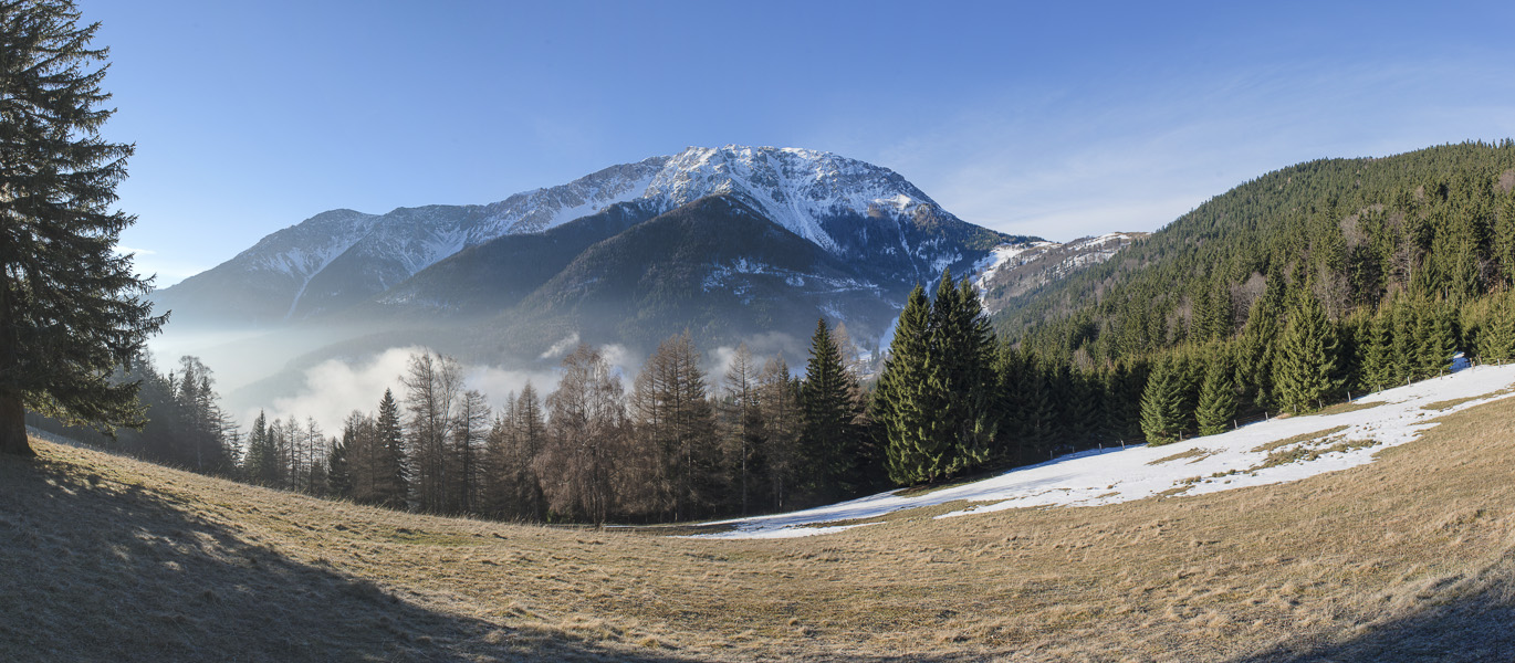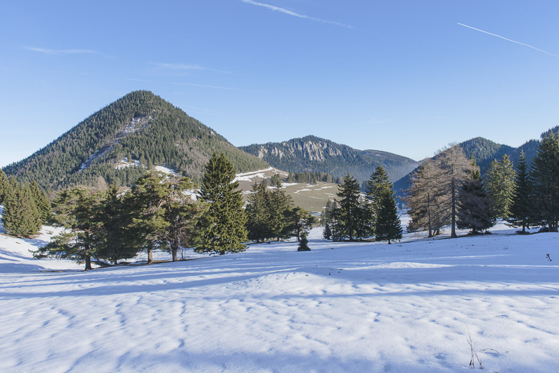 Ich wandere oberhalb der Mamauwiese die paar Schritte durch den Wald für einen Blick über die Schoberalm und zum Schober (1.213 m), der von hier kegelförmig erscheinende Berg.