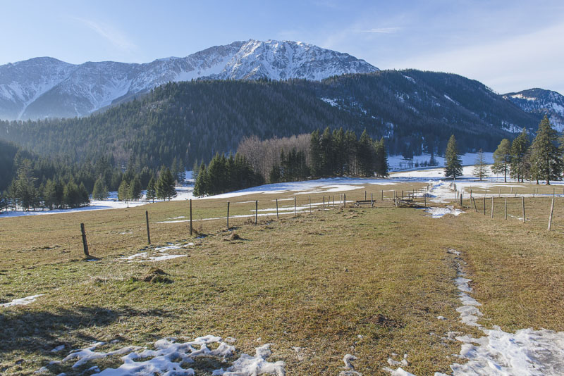 Der Blick in die entgegengesetzte Richtung, nachdem ich die Wiese entlang (hinauf) gewandert bin. Der Schneeberg dominiert hier die Aussicht. Davor die Dürre Leit´n zum Fadensattel.