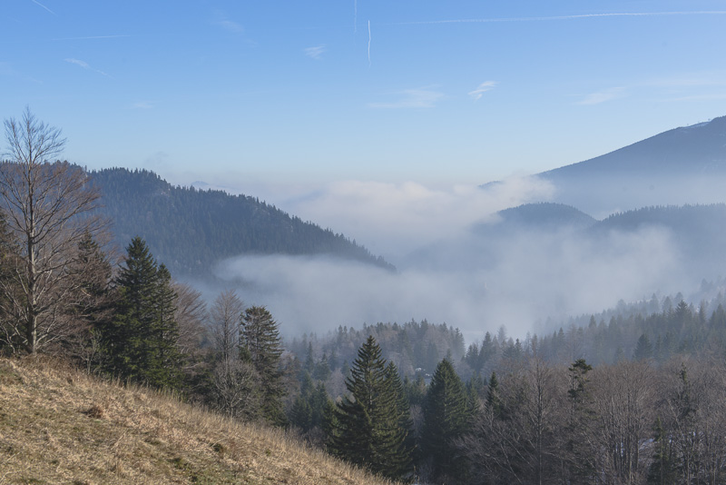 Ich steige an dem dem Schneeberg gegenüberliegenden Südhang empor und blicke bald über den - natürlichen und künstlichen - Nebel.