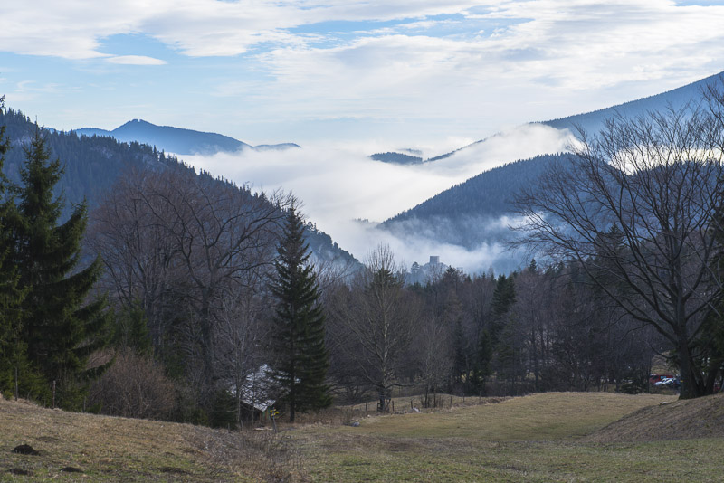 Blick über das Nebelmeer, das über dem Puchberger Tal liegt. Links die Hohe Wand, in der Mitte der Himberg und der Höhenzug zum Gutenmann, ganz rechts die Abhänge des Hohen Hengsts.