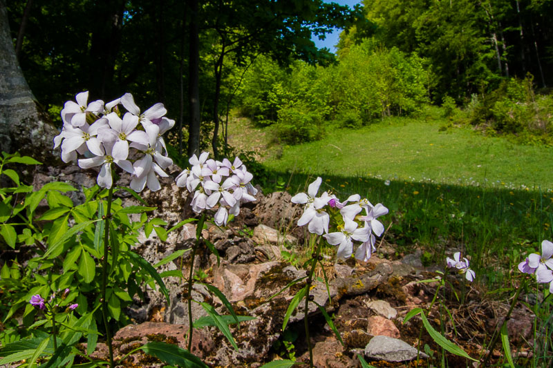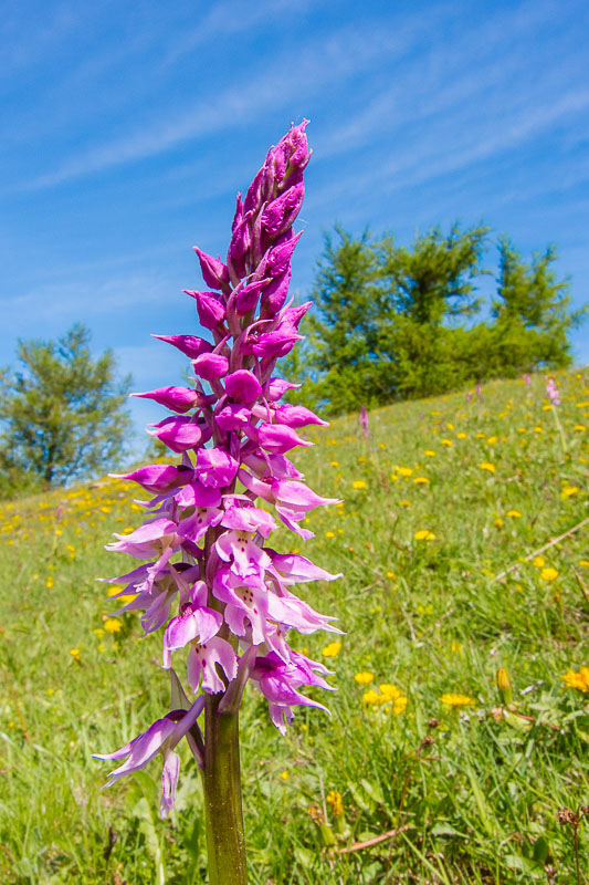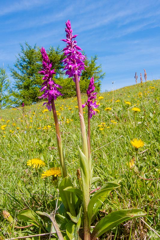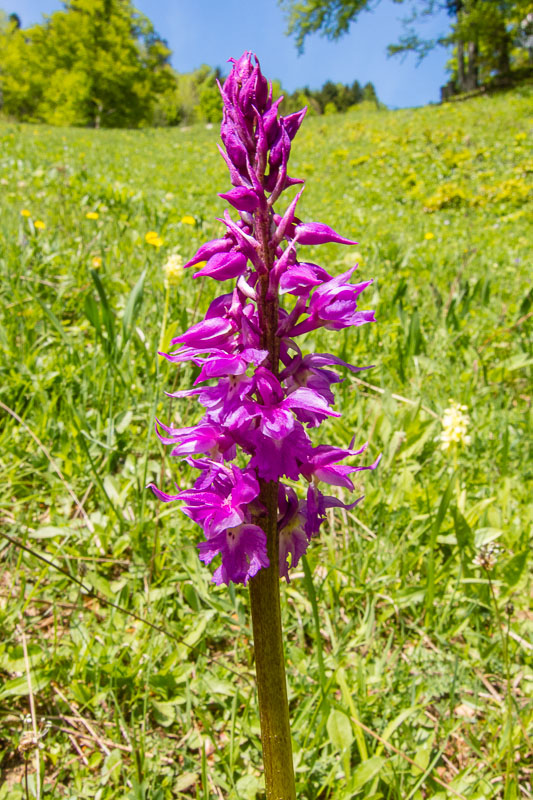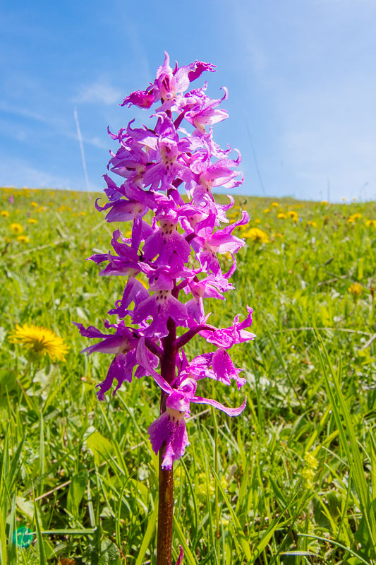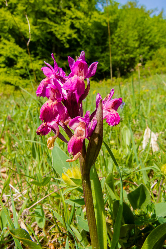 To the left of the marked path, in the grass, first exemplars of the Early purple orchid (Orchis mascula)