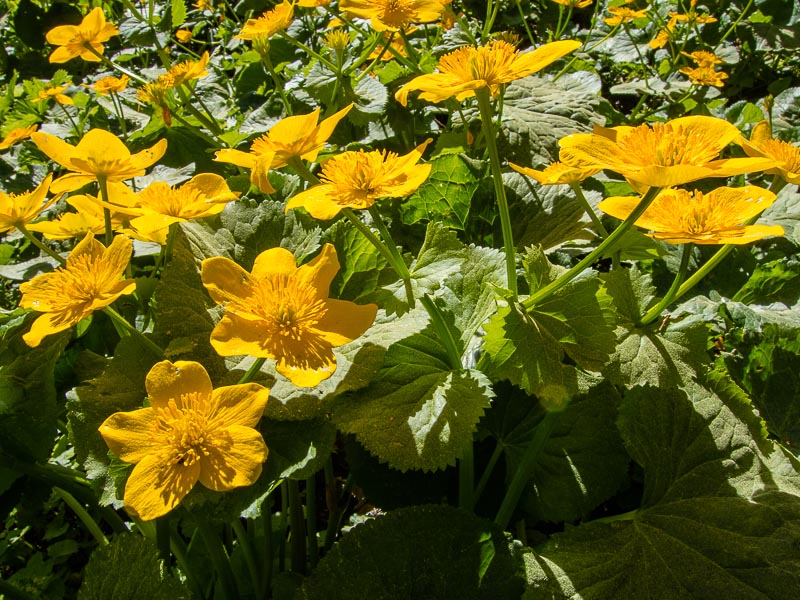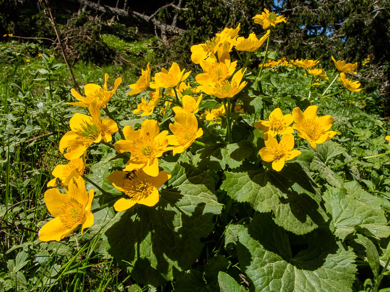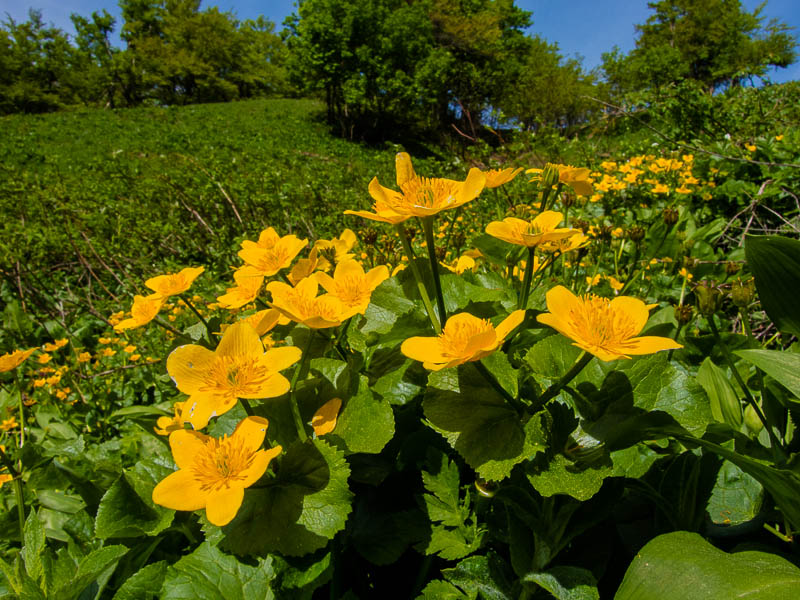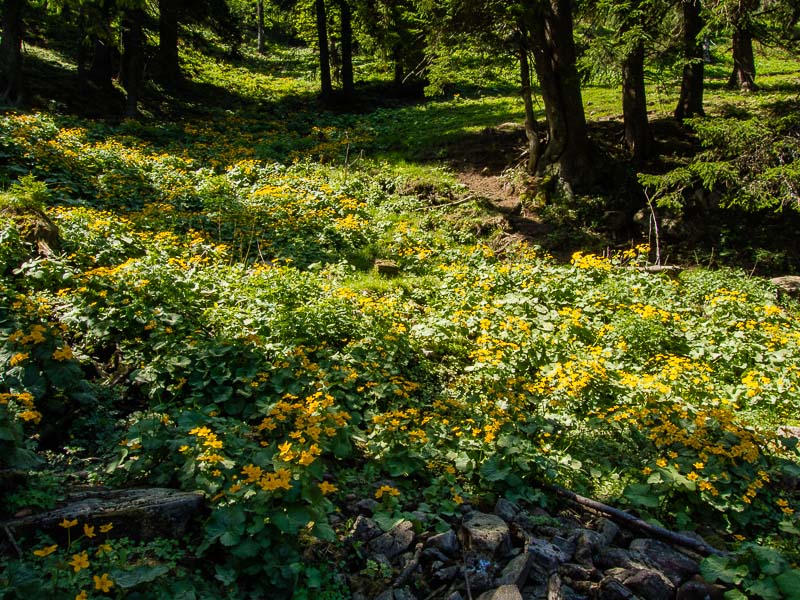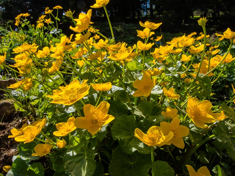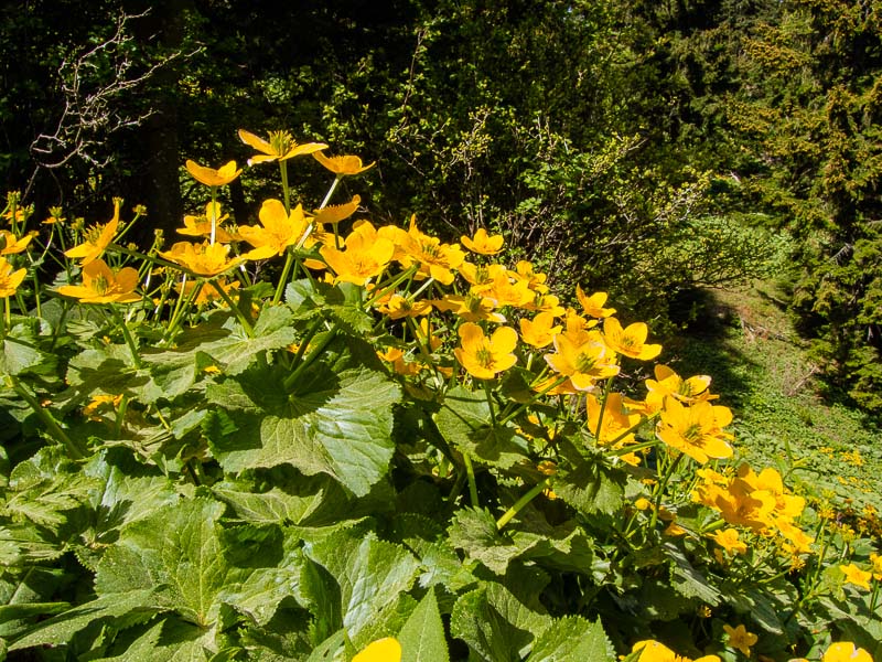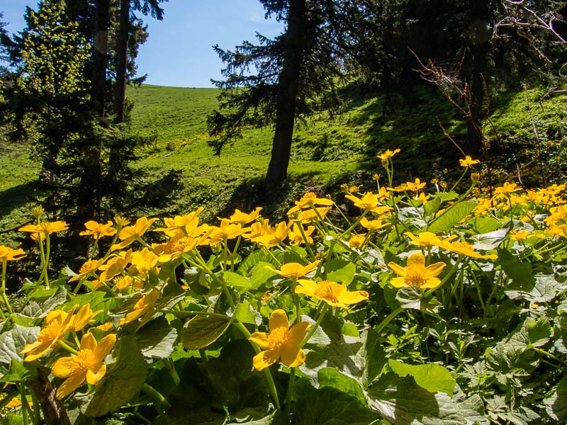 Lots of wet places, where water is dripping out of the ground and where lots of kingcups (Caltha palustris) have settled.