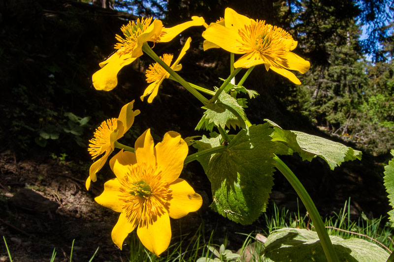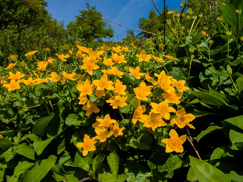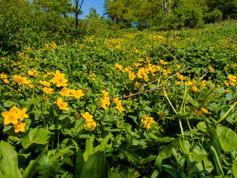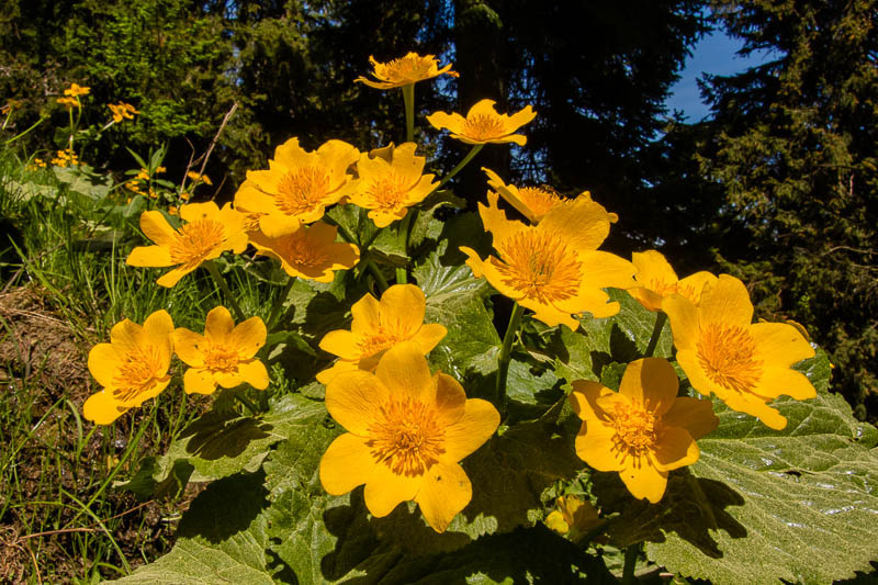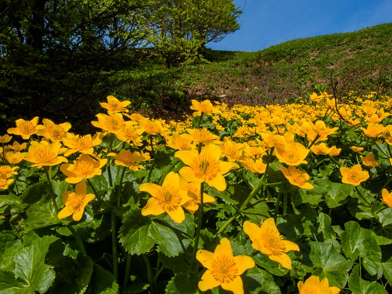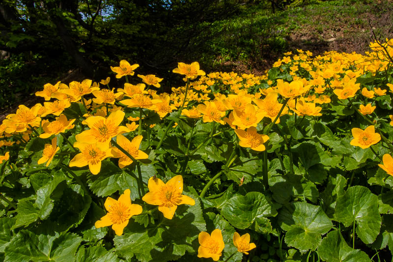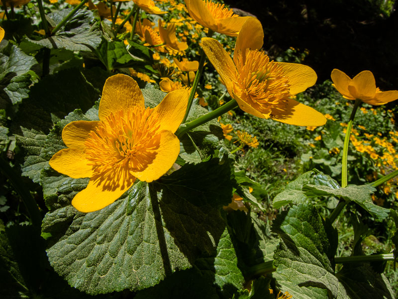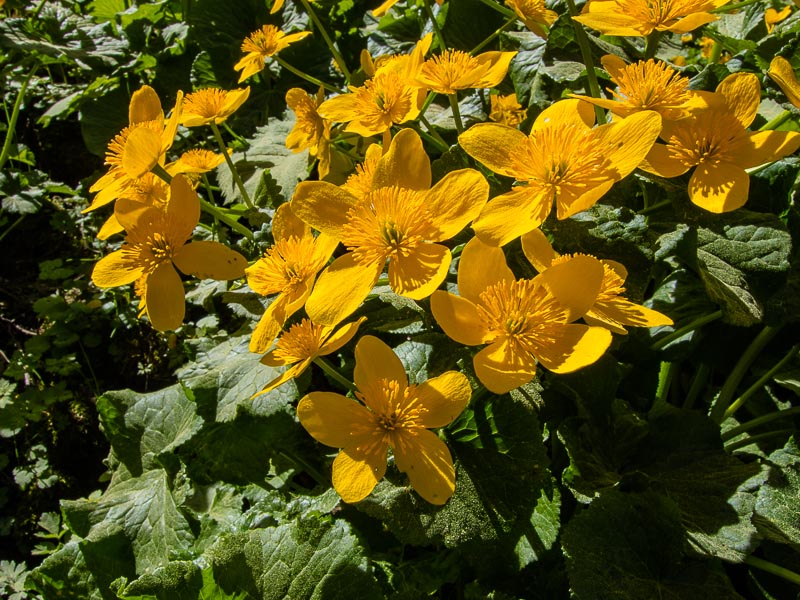 Lots of wet places, where water is dripping out of the ground and where lots of kingcups (Caltha palustris) have settled.