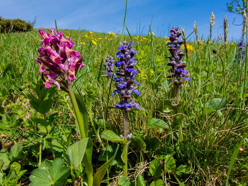 Elder-flowered orchid (Dactylorhiza sambucina) and Common bugle (Ajuga reptans).