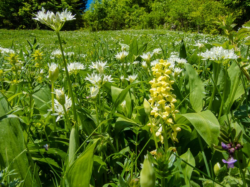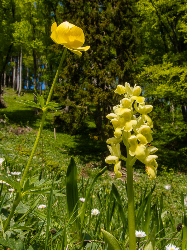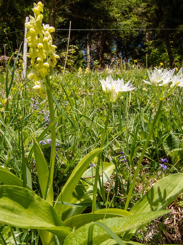 Pale-flowered orchid (Orchis pallens) together with flowering ramson (Allium ursinum)!