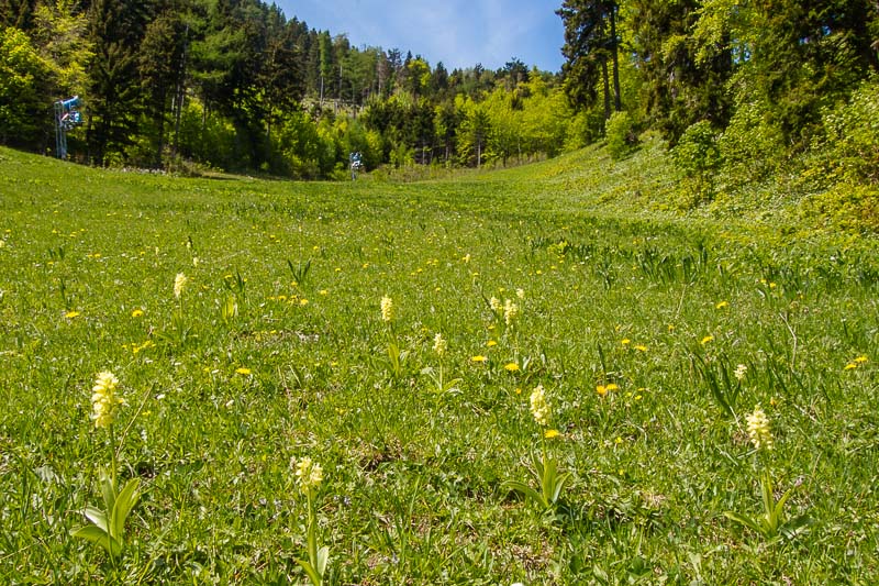 I decide to walk down the steep skiing piste and find lots of Pale-flowered orchid (Orchis pallens)