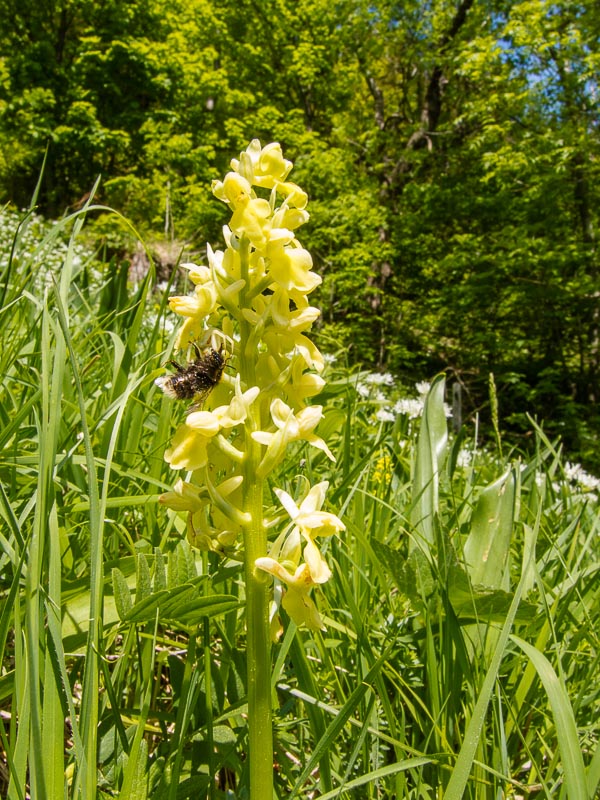 Pale-flowered orchid (Orchis pallens) with a visitor.