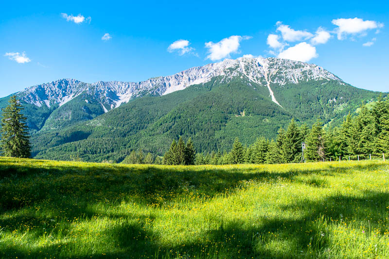 First, we walk up from Losenheim to the Scharbrunstwiese, where we get a good view to the Schneeberg.