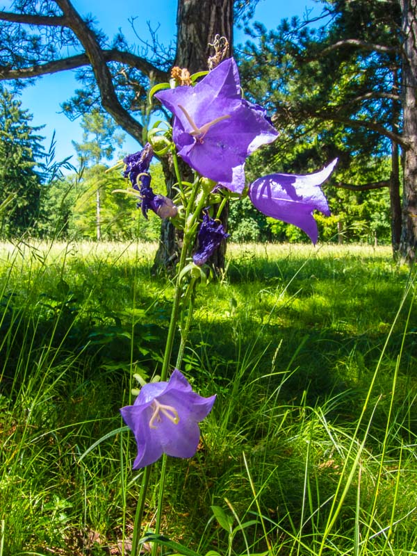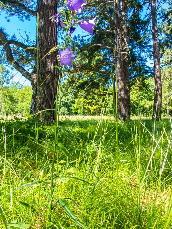 Die Peach-leaved bellfower (Campanula persicifolia) is essetial for the survival of the Red Helleborines: the flowers of the red helleborines are confused by the bees with the bellflowers, so they are visited in between and pollinated. What seems to be different colours for humans, is seen as identical by the bees, which can see a different spectrum of light, thus making the colour of the two species undiscernable for them.