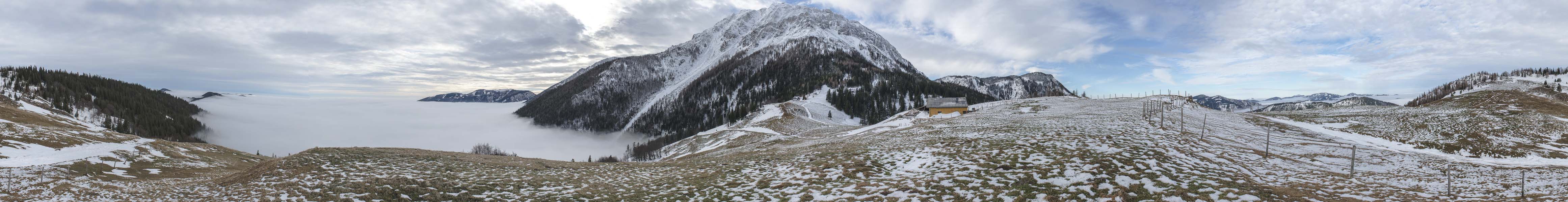 360 Grad Panoramablick vom Fadensattel. Links die Dürre Leiten zur Mamauwiese und zur Dürren Wand, dann Hoher Hengst und Schneeberg, Kuhschneeberg und rechts dahinter die Gutensteiner Alpen mit dem Unterberg. Ganz rechts der Beginn der Dürren Leiten.
