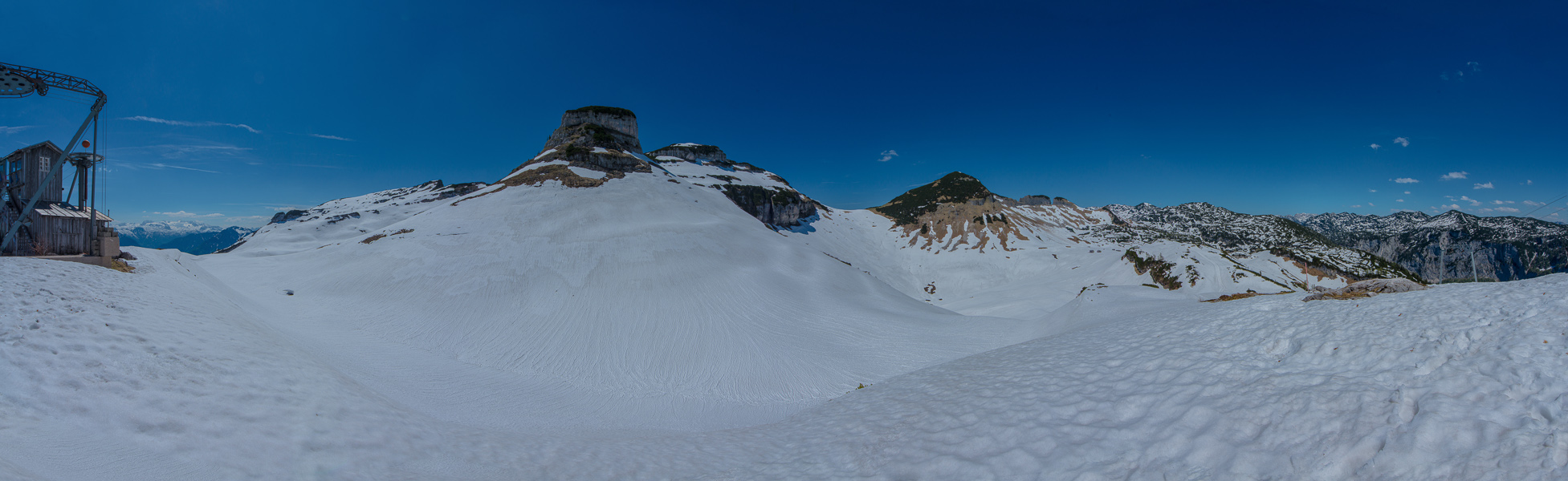 Panorama von der Bergstation der beiden Schlepplifte: Loser und Hochanger, Atterkogel, Greimuth und Bräuningzinken. Ganz rechts das Tote Gebirge.