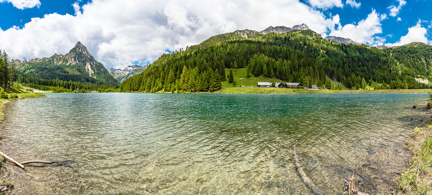 Panorama des Schliereralmsees. Hinten die Schliereralm (mit Gasthof) und ganz rechts der Staudamm.