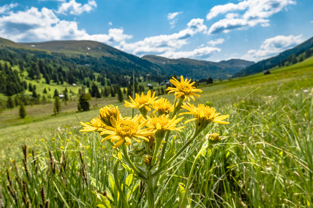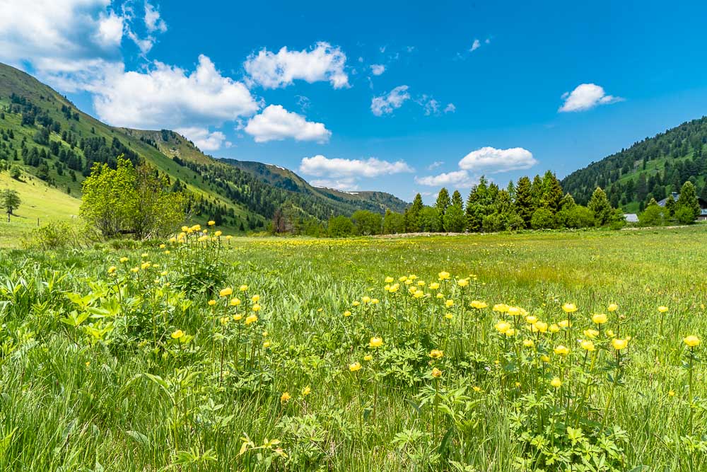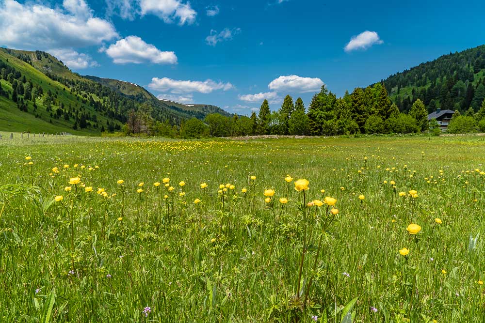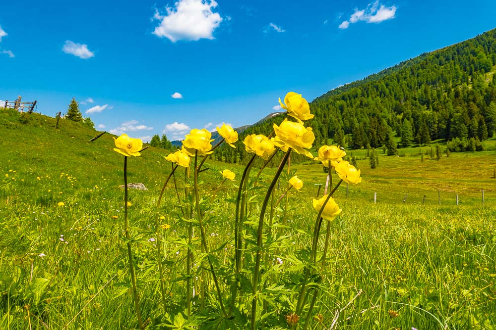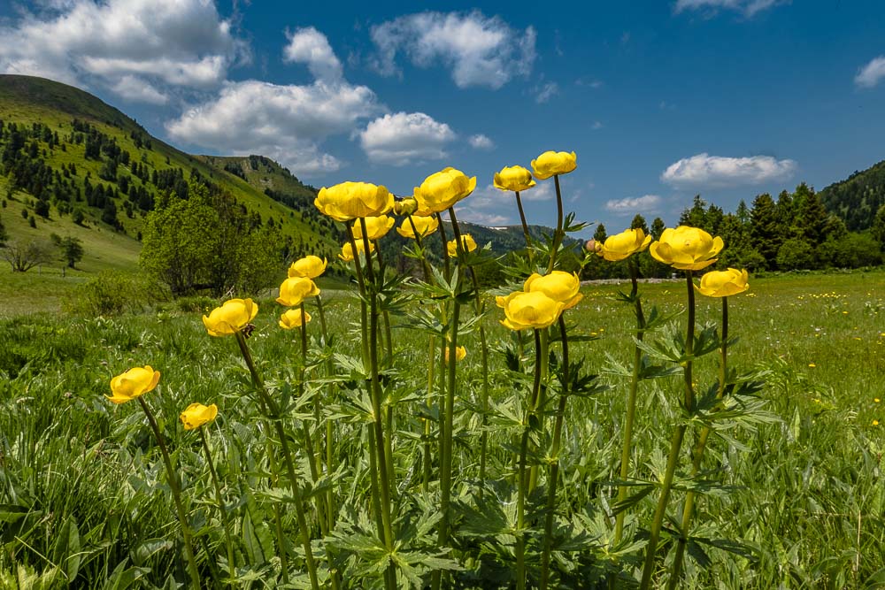 Oben auf der Wasserscheide ist es feucht, hier blühen wieder die Trollblumen (Trollius europaeus)