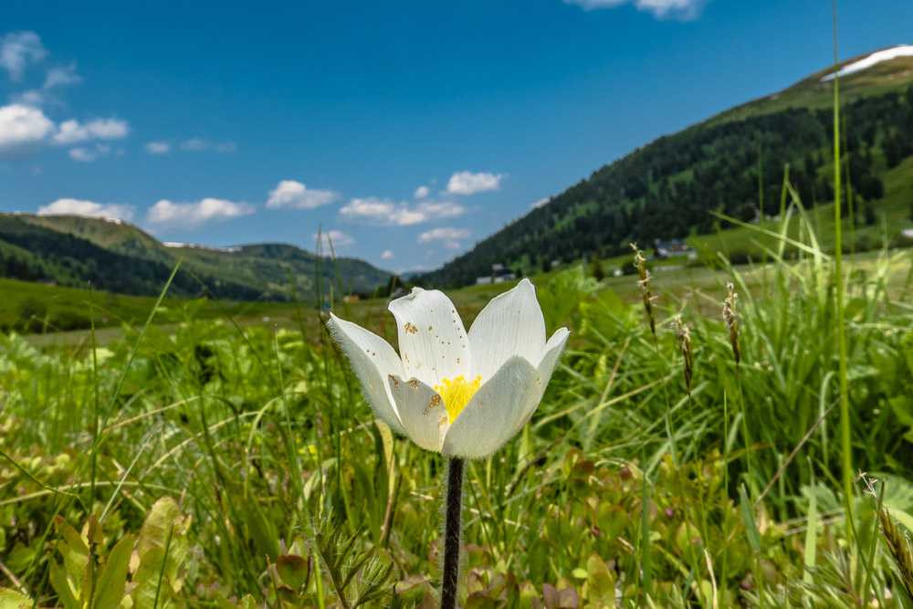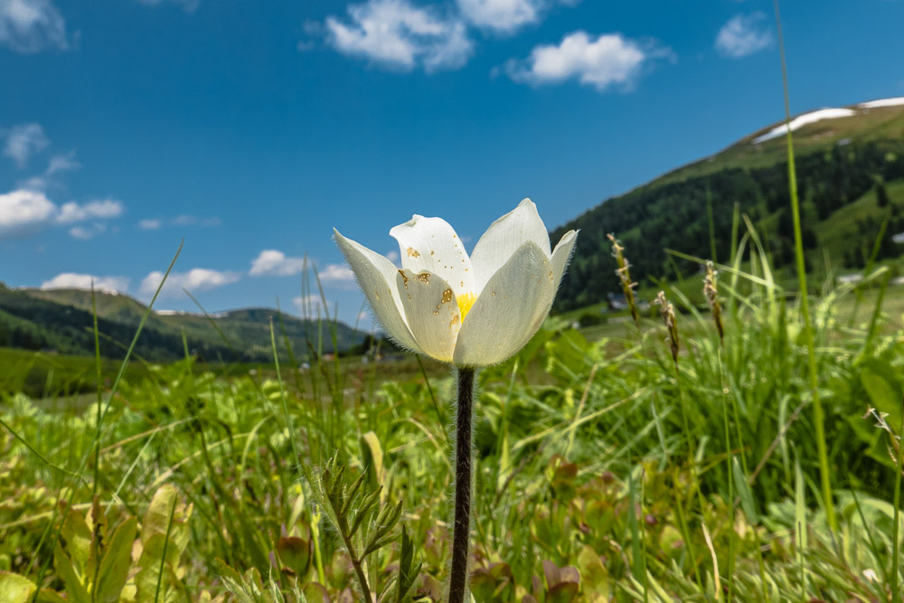 Knapp vor der Dr. Josef Mehrl Hütte blühen einige Exemplare der Kleinen Alpen Küchenschelle (Pulsatilla alpina subsp. austriaca).