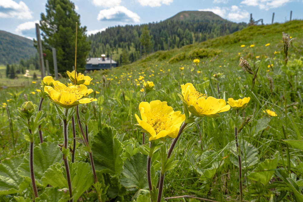 Mit Blick auf die Dr. Josef Mehrl Hütte eine wunderschöne Wiese mit Alpenpetersbart (Berg - Nelkenwurz, Geum montanum) ...