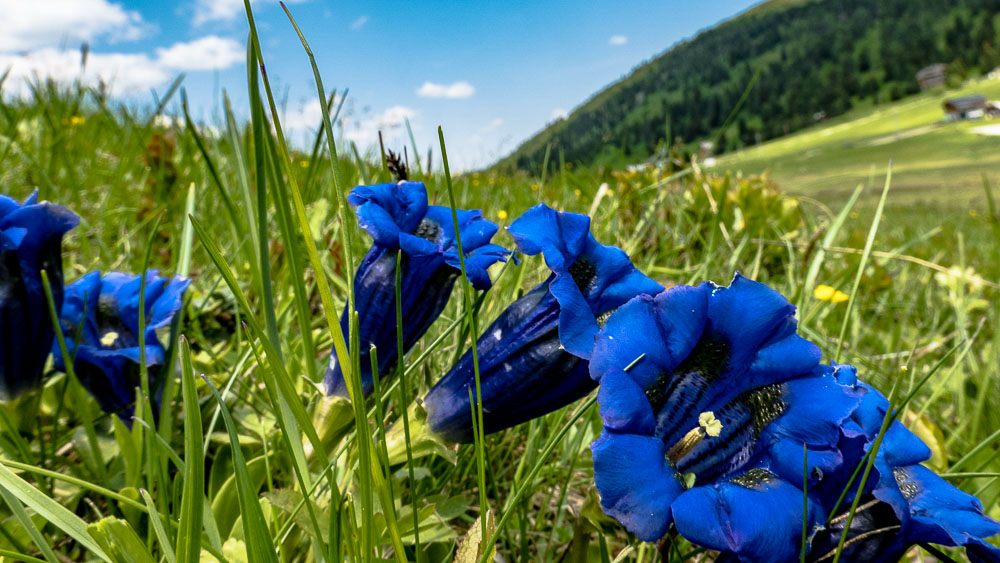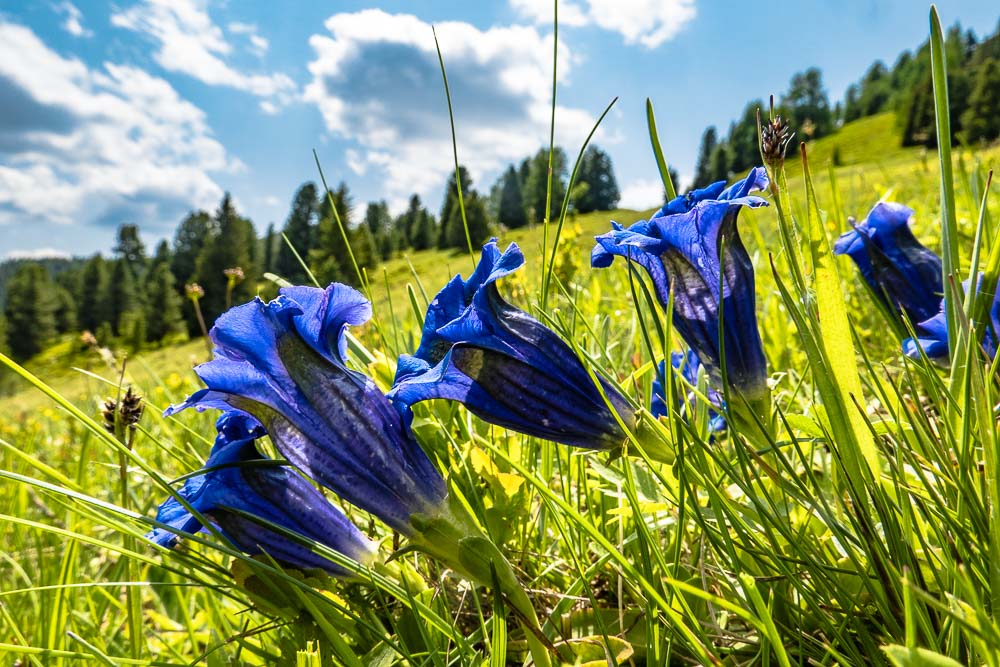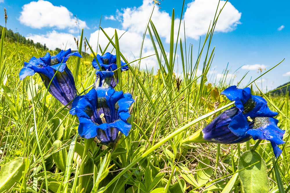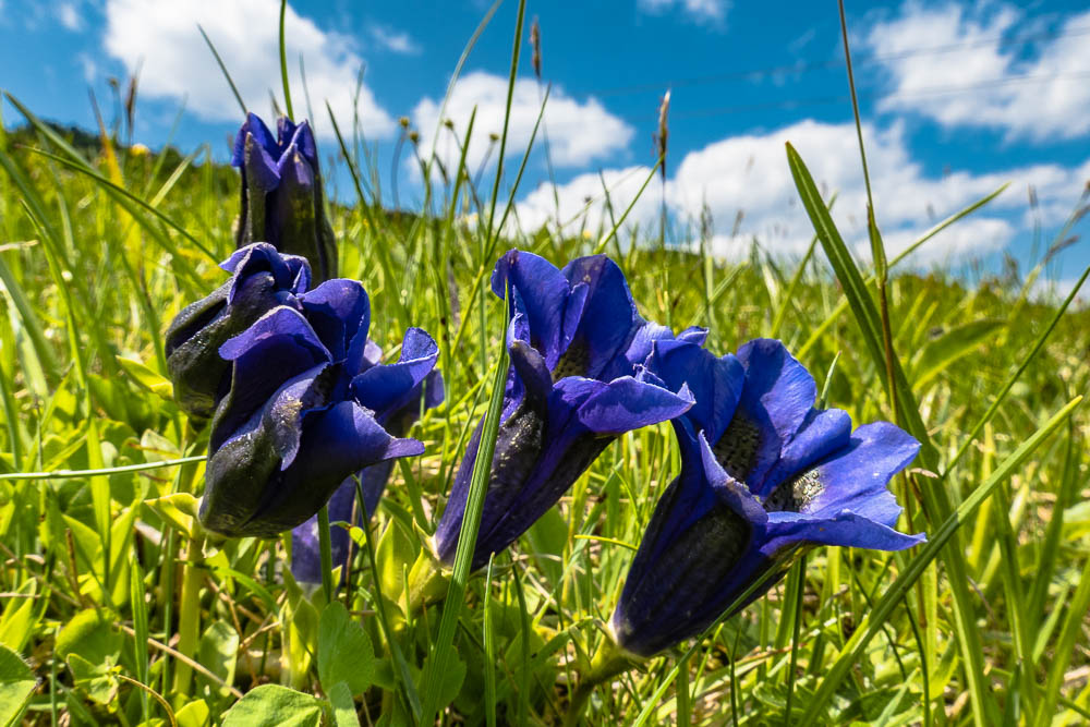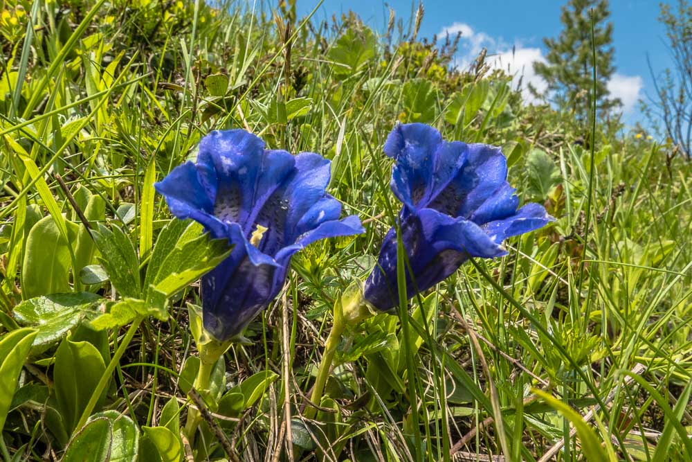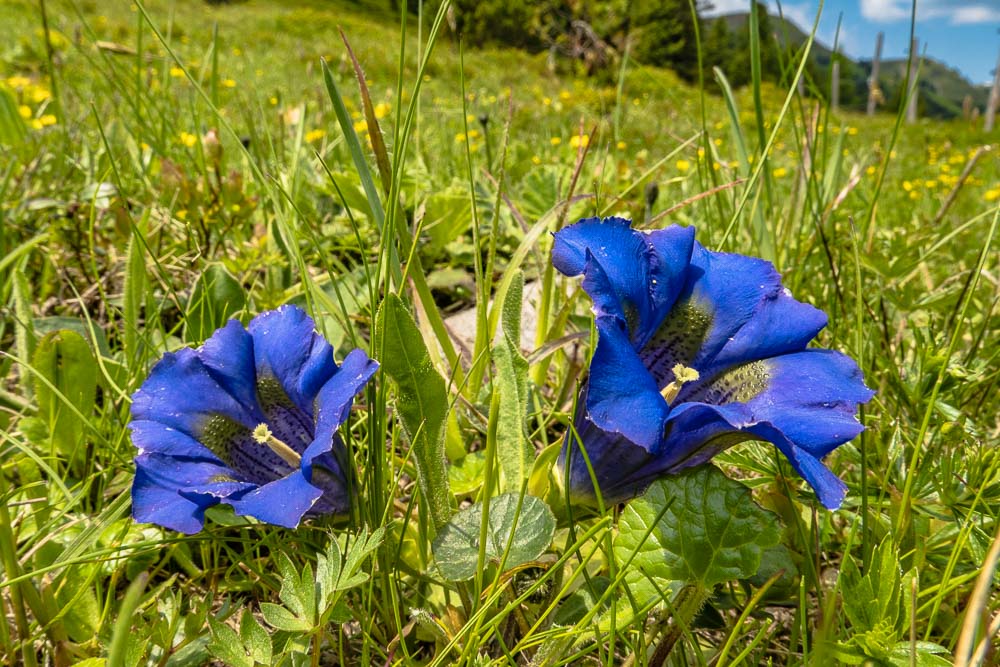 Es gibt hier einen Schlepplift. Auf der Piste scheinen sich die Enziane besonders wohl zu fühlen, hier blühen hunderte.