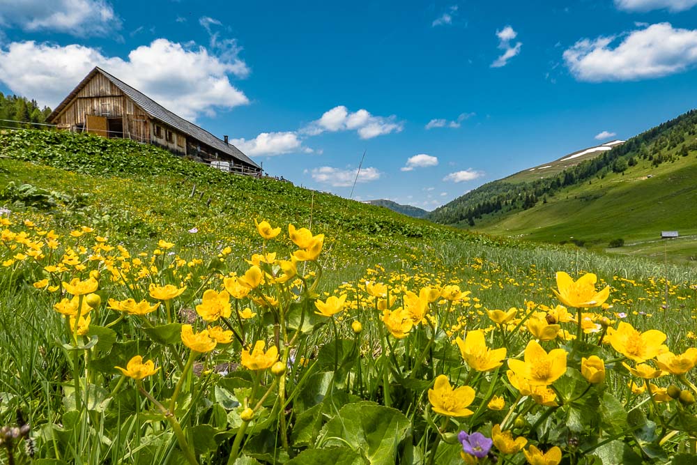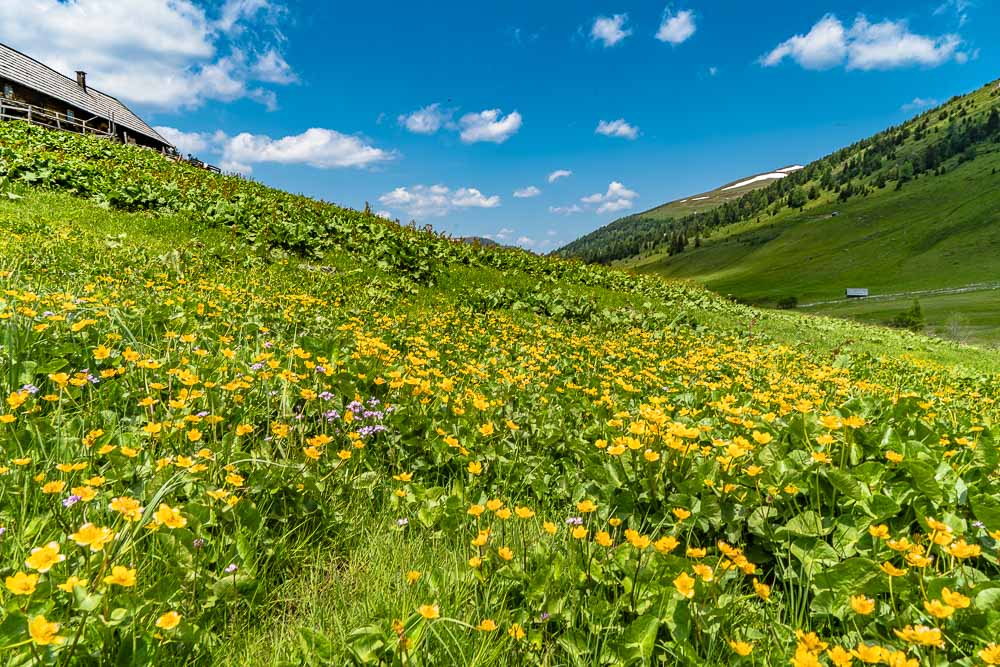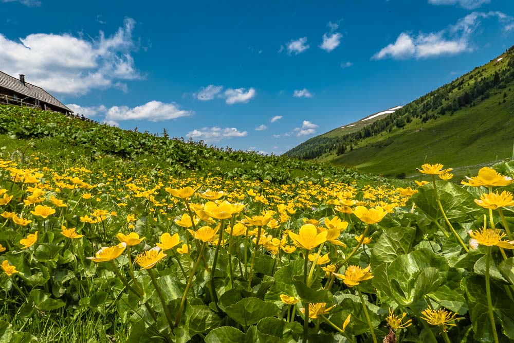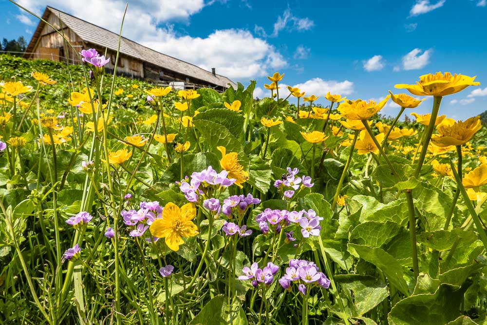 Ich fahre noch ein Stück weiter ins Tal hinein. Bei einer Alm blühen neben dem Bach tausende Sumpfdotterblumen (Caltha palustris).