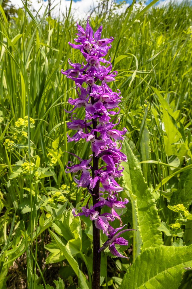 ... und auf der östlichen, bergseitigen Böschung ein einzelnes Exemplar eines Stattlichen (männlichen) Knabenkrauts (Orchis mascula ssp. speciosa).