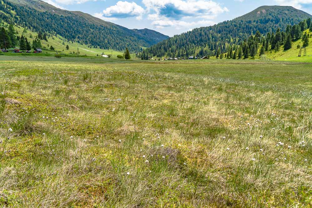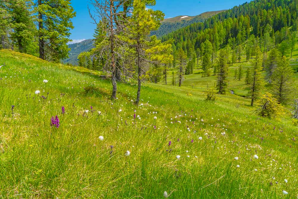 Offener Almboden mit breitblättrigen Knabenkräutern (Dactylorhiza majalis) und Scheiden - Wollgras (Eriophorum vaginatum).