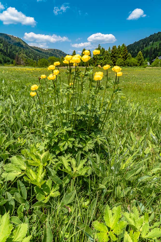 Auf den überwiegend feuchten Wiesen finden sich immer wieder Trollblumen (Trollius europaeus)