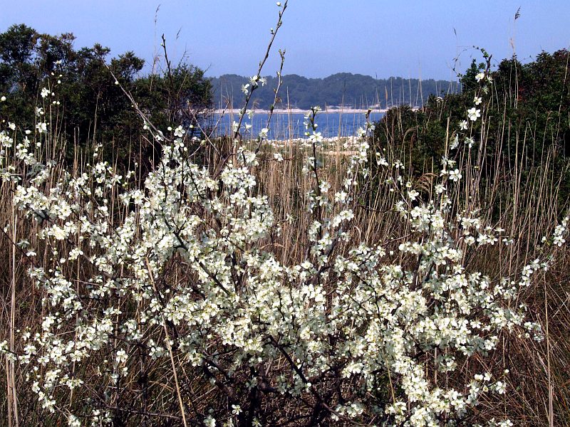 Nahe dem Campingplatz eine kleine ebene, feuchte Stelle mit einem kleinen grasbewachsenen Spielplatz. Am Rand blüht Schlehdorn.