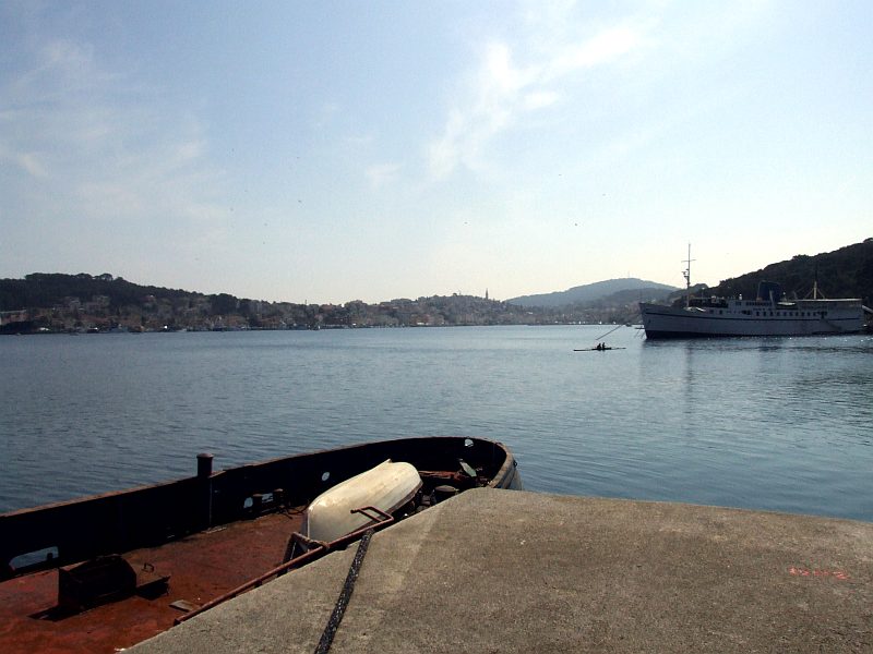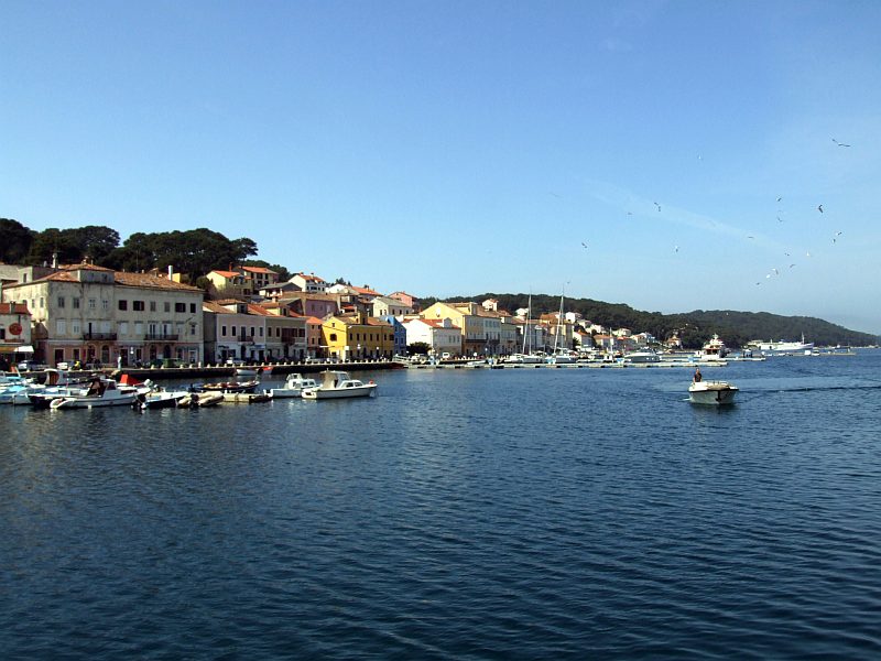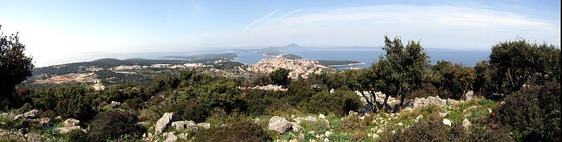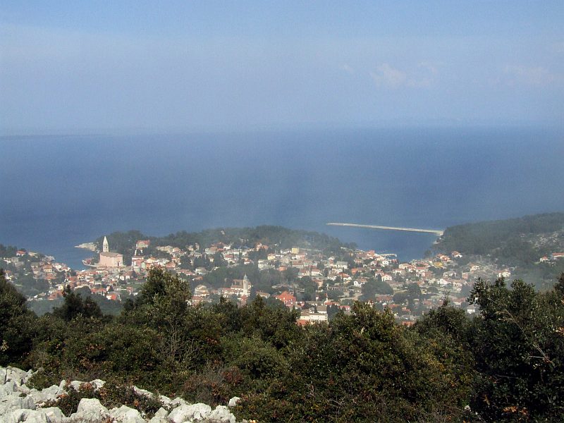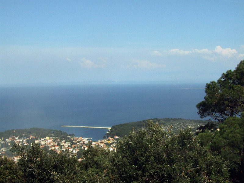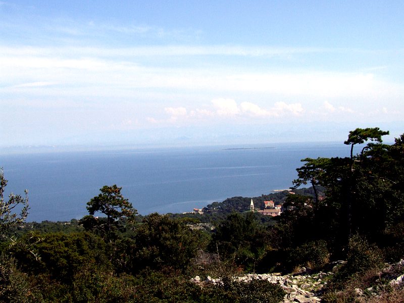 Von etwas weiter oben der Blick über Veli Losinj - und über das Meer bis zum weit weg im Dunst gerade noch erkennbaren kroatischen Festland, mit Bergen bis 1.600 m Höhe.