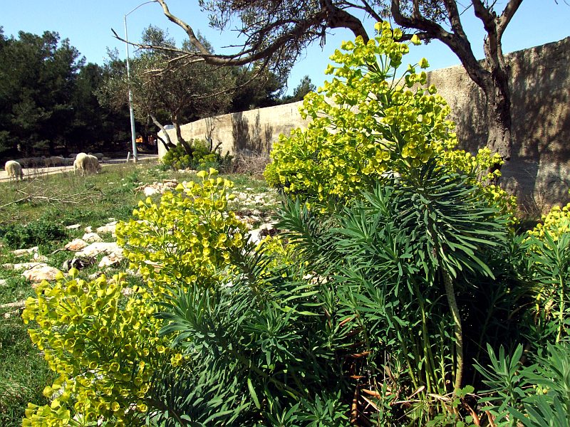 ... den Berg hinauf - zunächst beim Kalvarienberg vorbei. Eine Schafherde bevölkert hier die Straße. Was die Schafe übriglassen, blüht hier in Mengen: Palisaden - Wolfsmilch (Euphorbia characias)