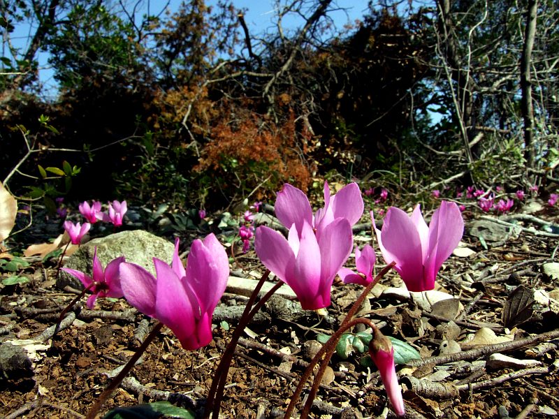 Geschweiftblättriges Alpenveilchen (Cyclamen repandum) wächst hier in der Macchie sowie in Wäldern teilweise massenhaft.