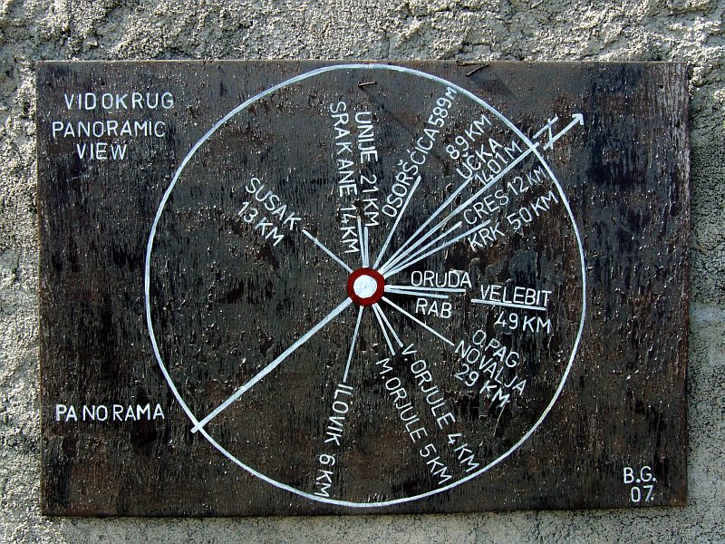 Panoramablick vom Südende der Insel Losinj mit den Nachbarinseln Male Orjule, Kozjak, Sveti Petar (teilweise im Nebel ) und Ilovik (fast ganz im Nebel). Hierher oder ins Bild klicken für eine größere Darstellung.