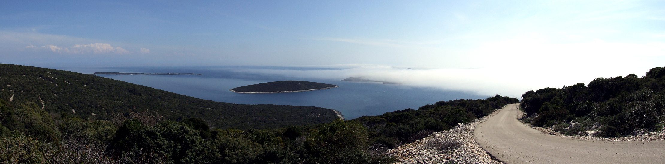 Panoramablick vom Südende der Insel Losinj mit den Nachbarinseln Male Orjule, Kozjak, Sveti Petar (teilweise im Nebel ) und Ilovik (fast ganz im Nebel).