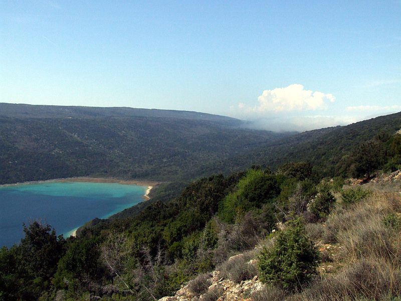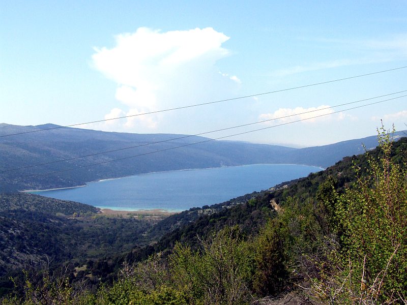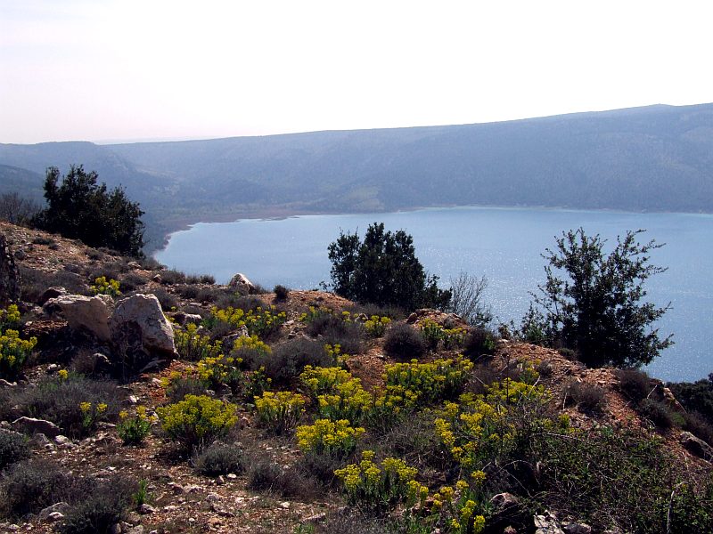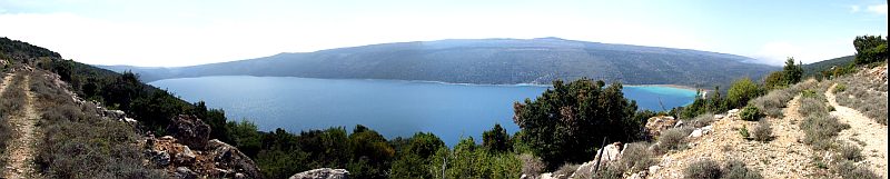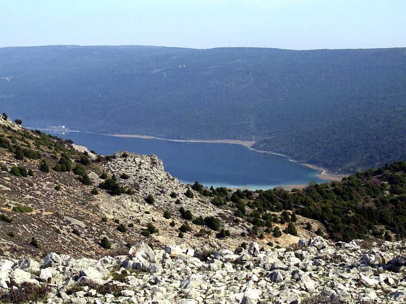 Der Vransko - See im Panoramabild. Seine Oberfläche liegt zwar über dem Meeresniveau, sein tiefster Punkt aber 74 m unterhalb. Er hat eine Fläche von 5,75 km2 und dient als Trinkwasserreservoir für Cres und Losinj. Sein Ufer ist daher Wasserschutzgebiet und darf nicht betreten werden. Hierher oder ins Bld klicken für eine größere Darstellung.