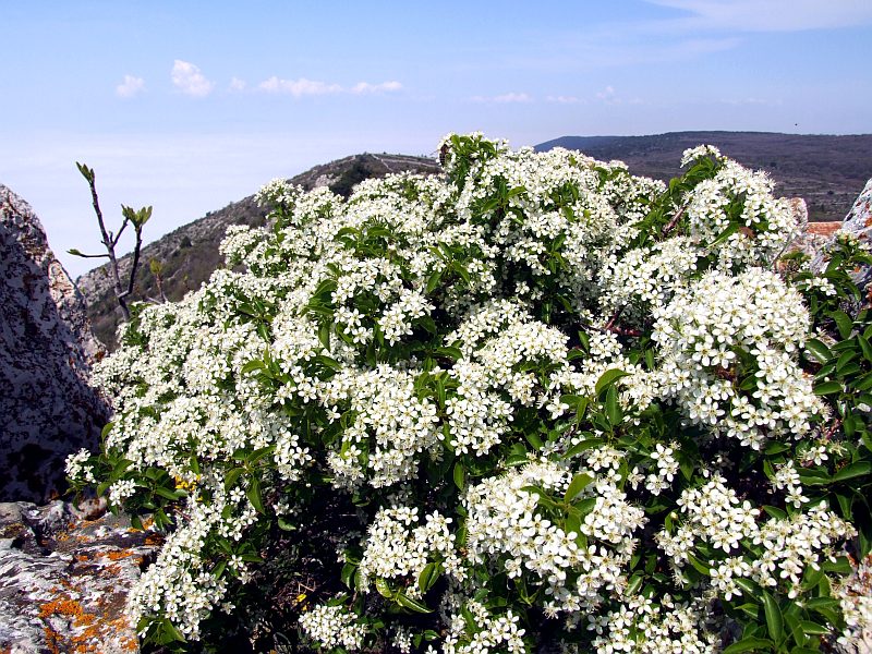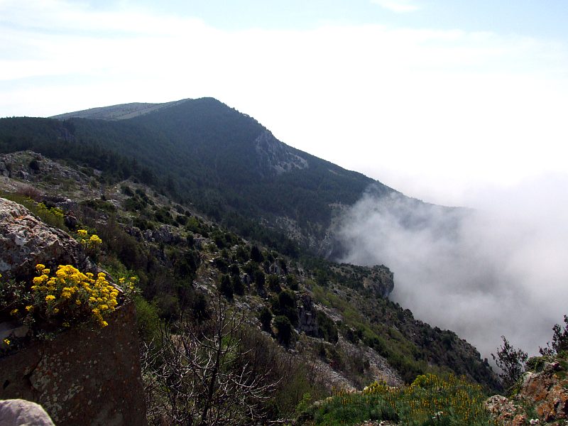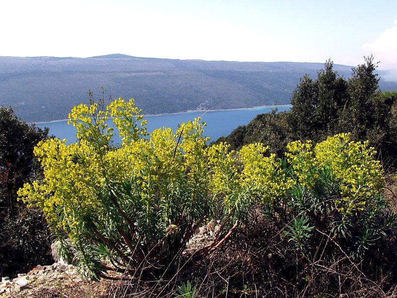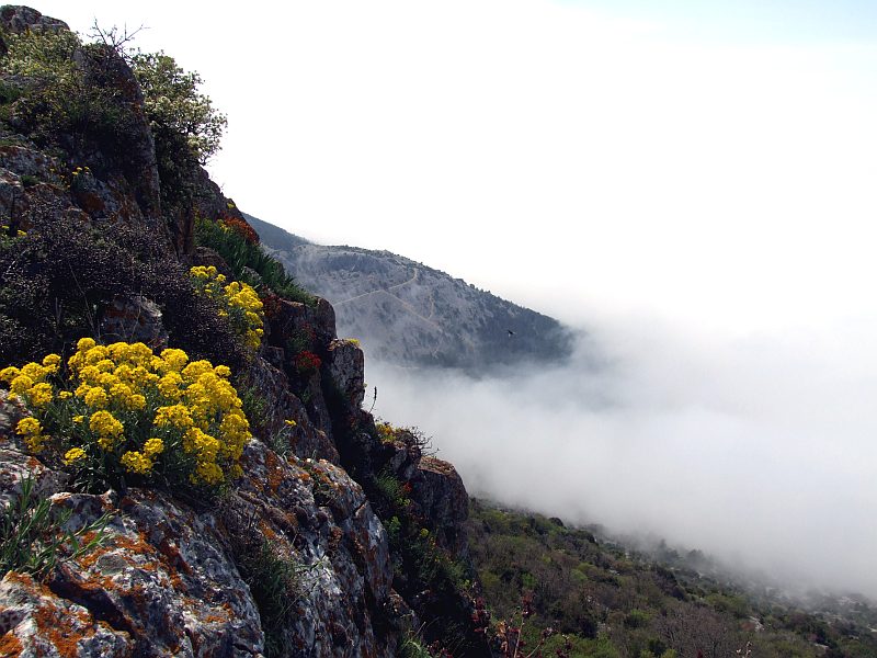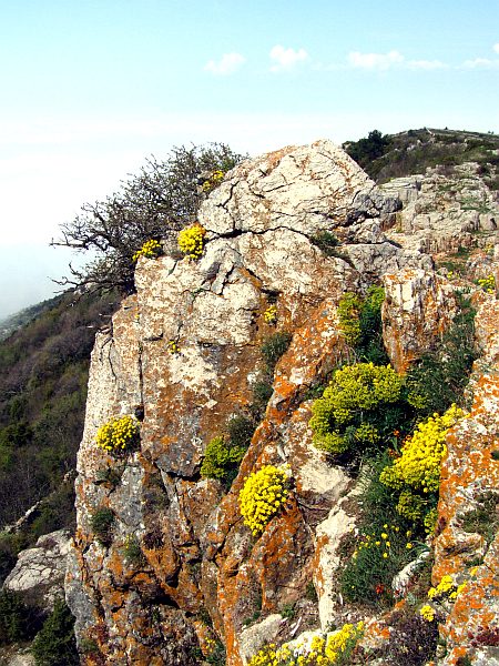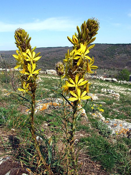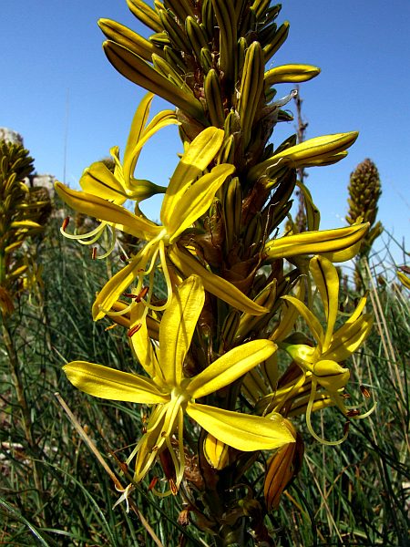 Hier, an einem wunderschönen Aussichtspunkt, blüht auch schon der gelbe Affodil (Gelbe Junkerlilie, Asphodeline lutea)
