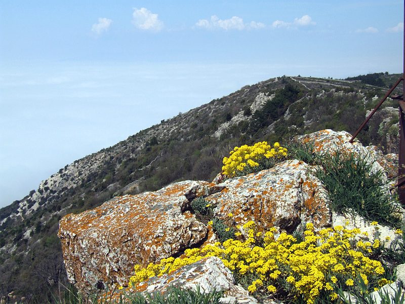 Felsen - Steinkraut auch in Massen in den Felswänden des Abhanges.